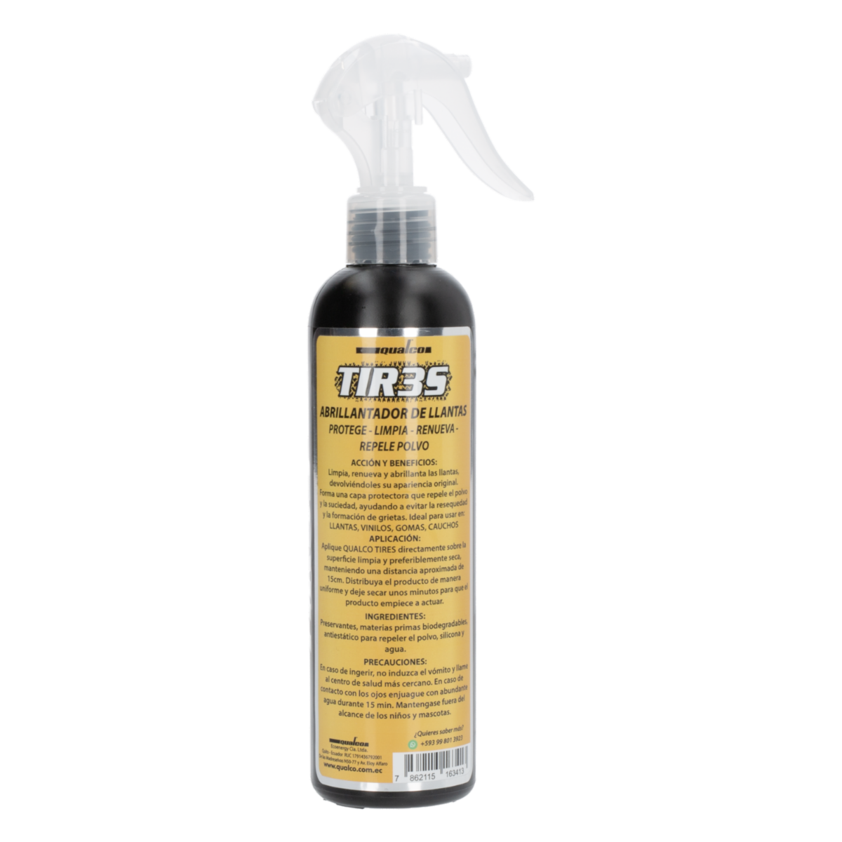 - Abrillantador de llantas QUALCO: aporta brillo duradero y protege el caucho de tus llantas. Fácil de aplicar y resistente a la lluvia y suciedad