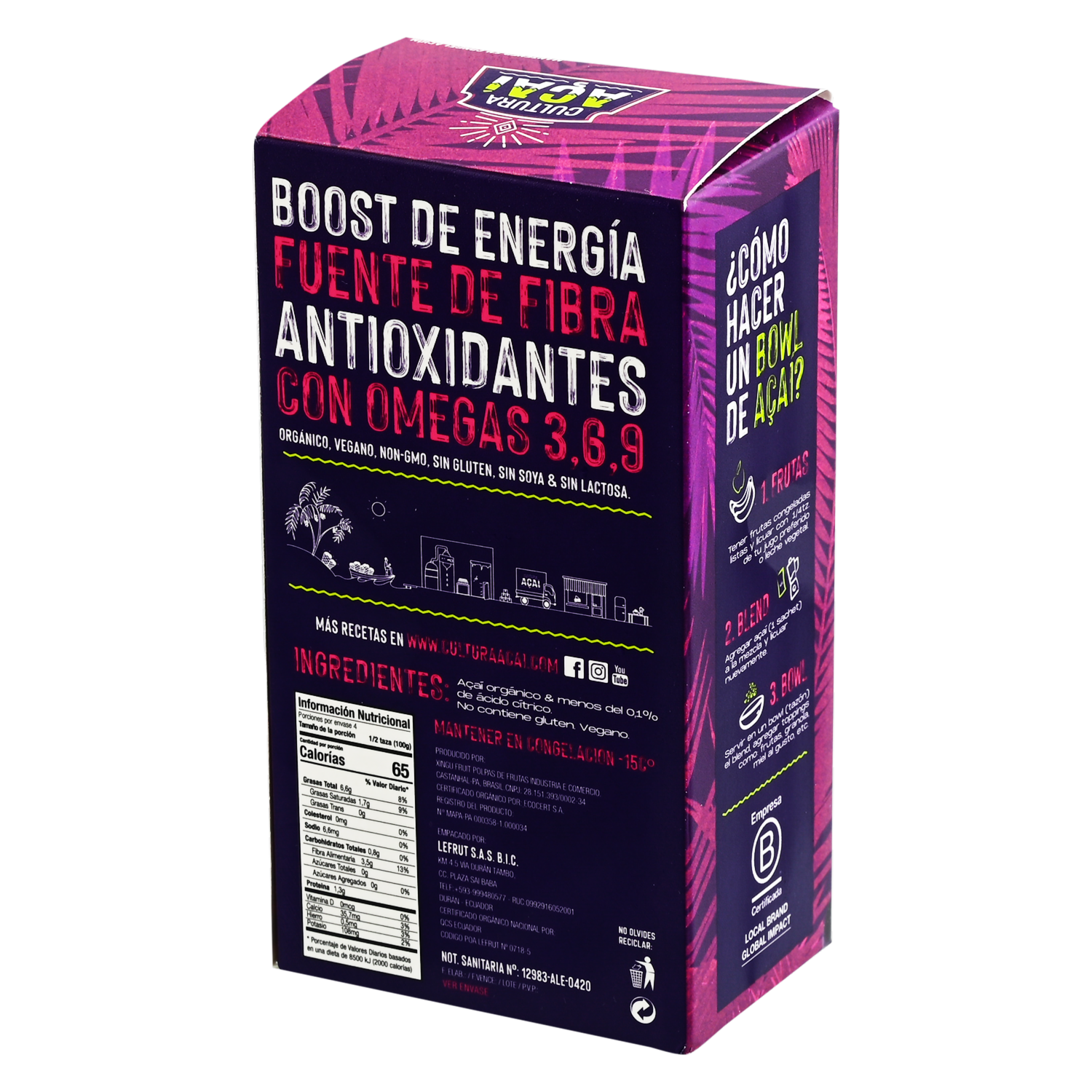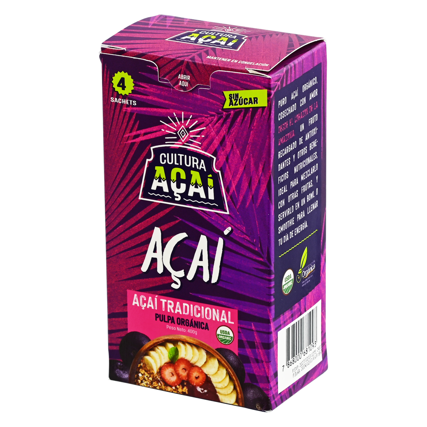 Açaí Orgánico Pulpa Congelada CULTURA AÇAÍ 4X100 G – CULTURA AÇAÍ. Disponible en nuestros locales. Precio y stock pueden variar según la tienda.