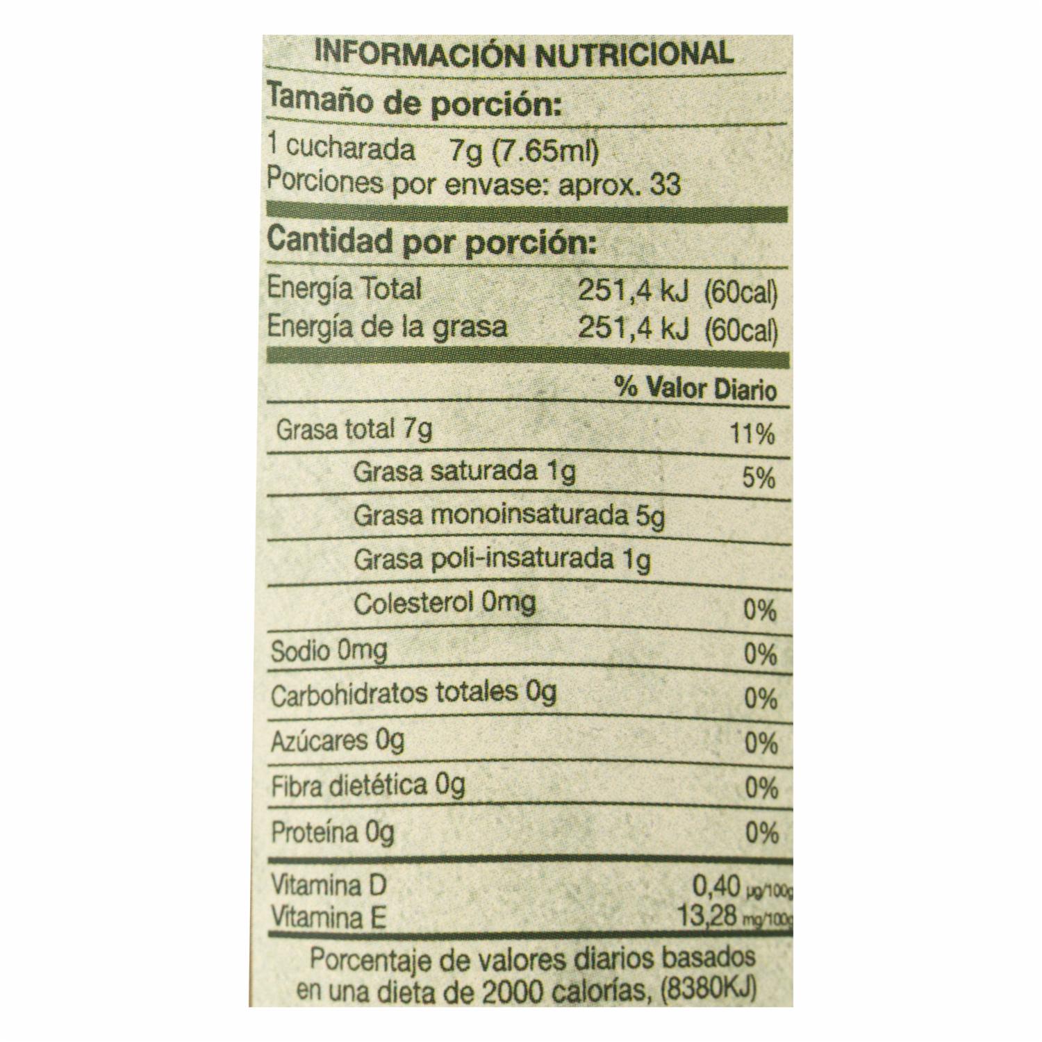 Es un producto 100% aguacate y es procesado bajo el método de cold press (prensa en frío) que garantiza que es un aceite 100% extraído del aguacate