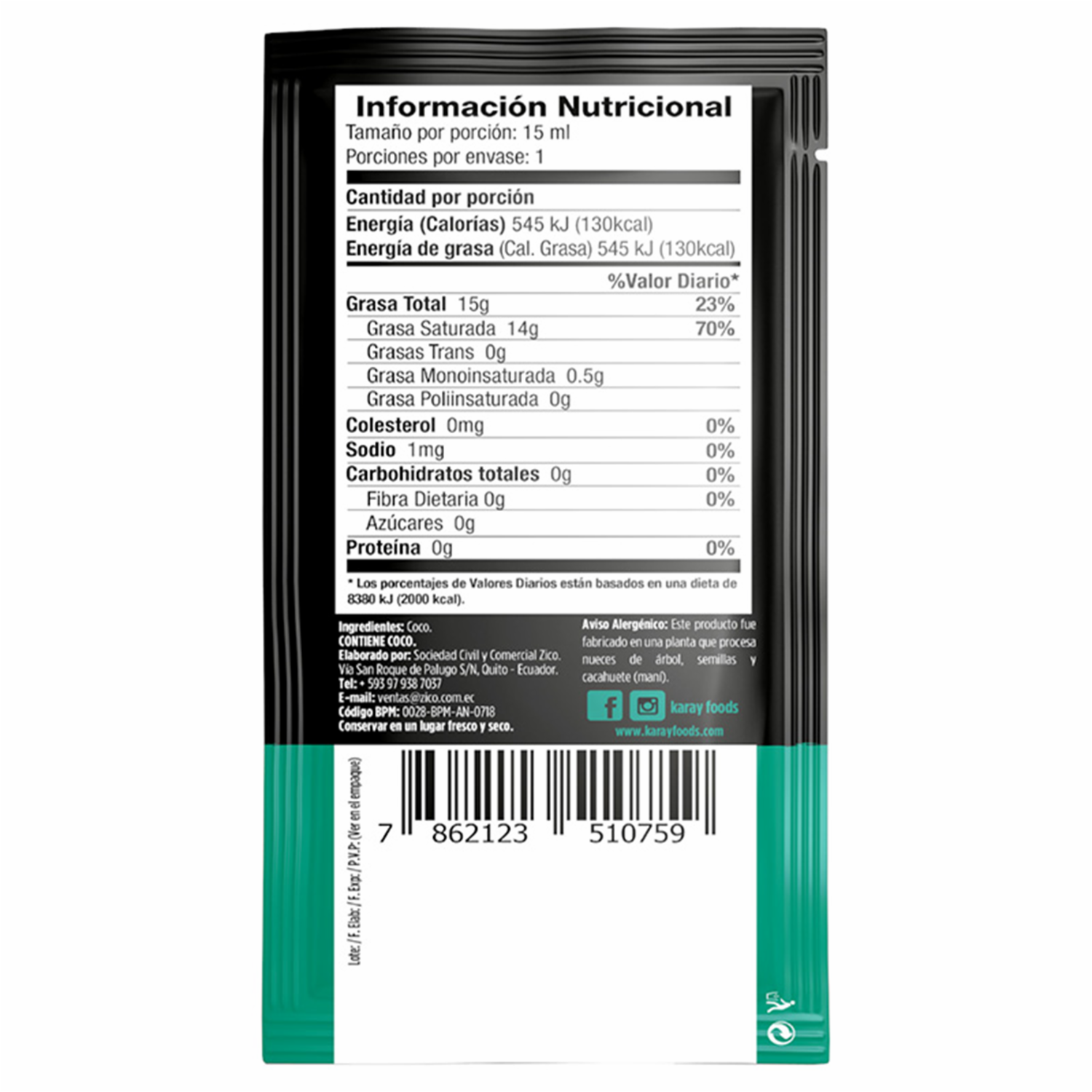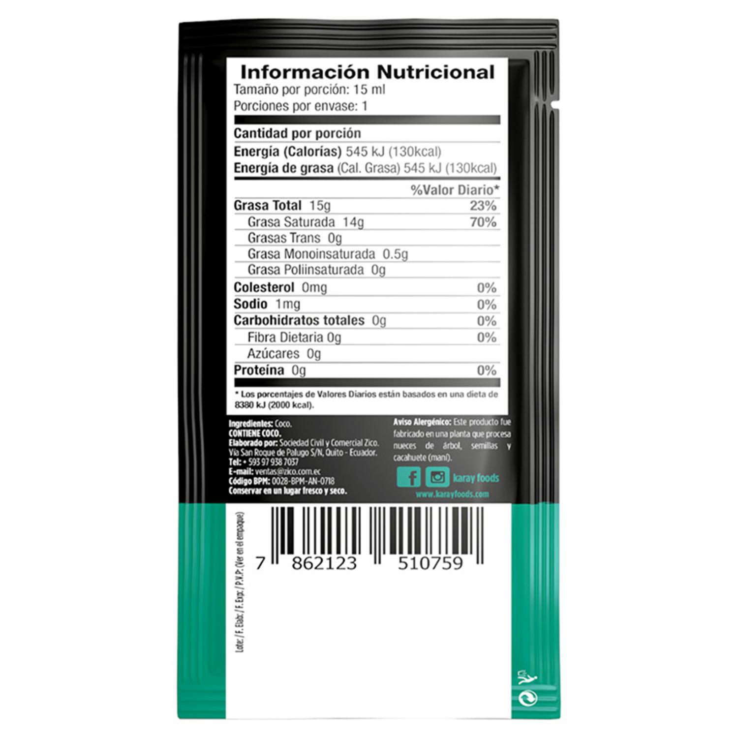 Aceite De Coco KARAY Sachets – KARAY. Disponible en nuestros locales. Precio y stock pueden variar según la tienda.