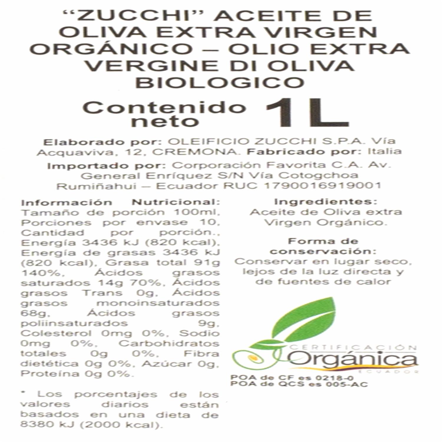 Aceite De Oliva Orgánico Extra Virgen ZUCCHI 1000 Ml