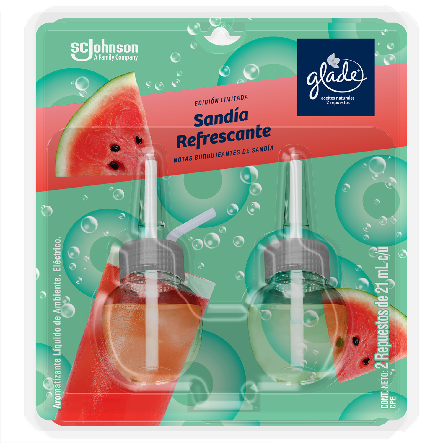 - Aceites Naturales Aromatizante De Ambiente Contiene Un Aparato Y Dos Repuesto De 21 Ml Cada Uno, Con Notas Burbujeantes De Sandía