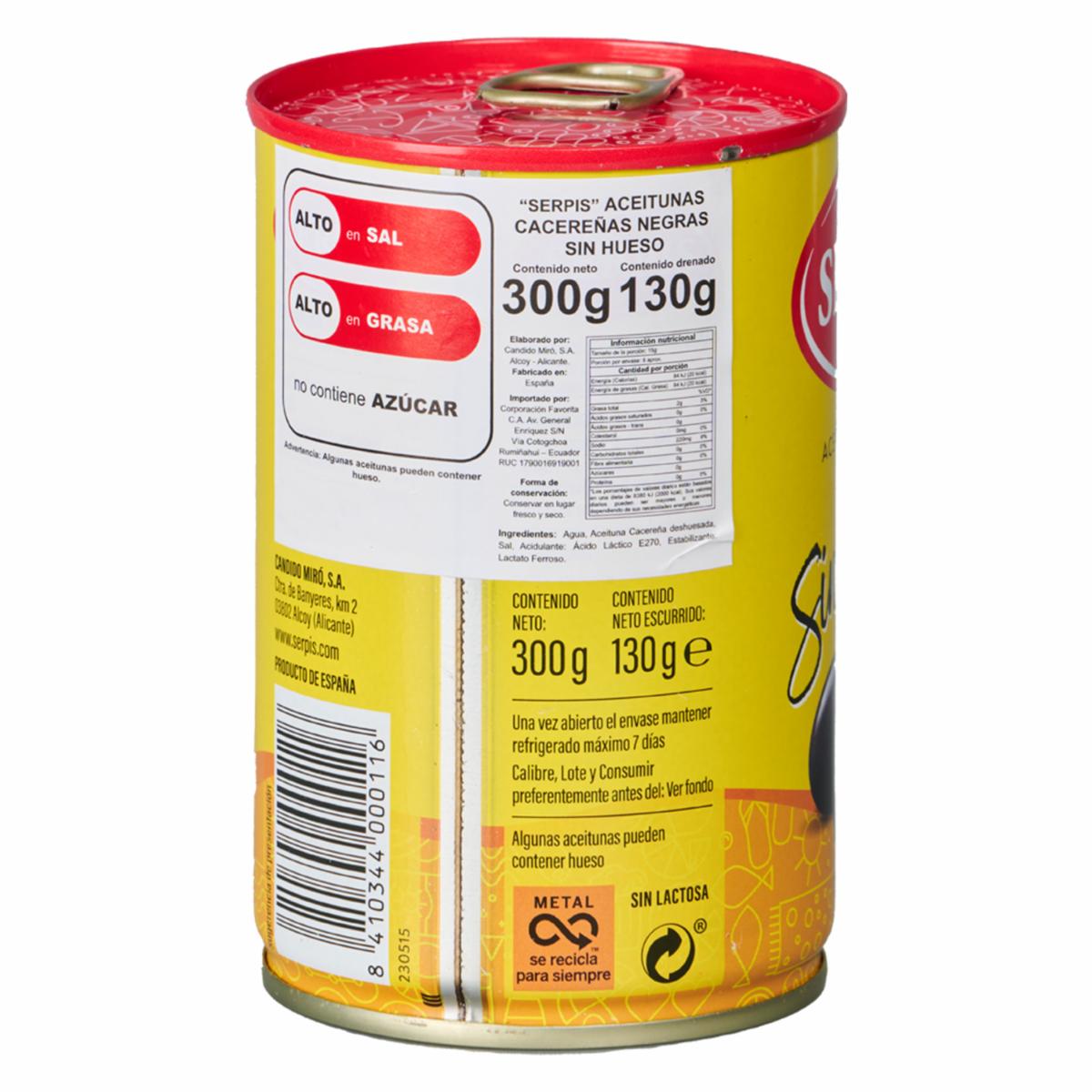 Aceitunas Negras Cacereñas Sin Hueso SERPIS 300 G – SERPIS. Disponible en nuestros locales. Precio y stock pueden variar según la tienda.