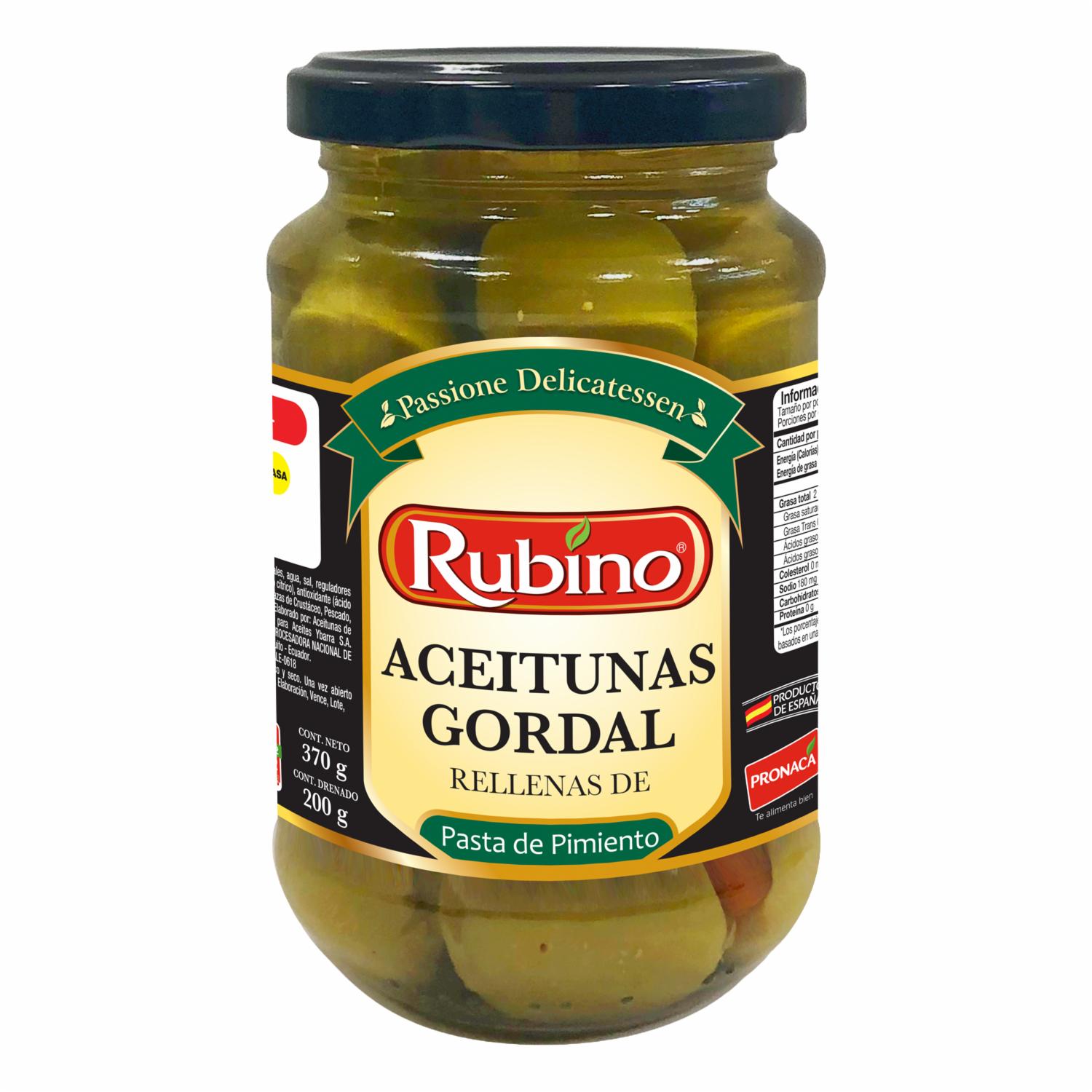 - Las aceitunas rellenas con pimiento Rubino son el complemento perfecto para tus momentos gourmet. Con un envase de 370 gramos, estas aceitunas ofrecen un equilibrio perfecto entre la frescura y el sabor intenso del pimiento, combinado con la suavidad y el carácter único de las aceitunas. Ideales para picar solas o como parte de una tabla de quesos y embutidos, estas aceitunas añaden un toque de sofisticación a cualquier ocasión