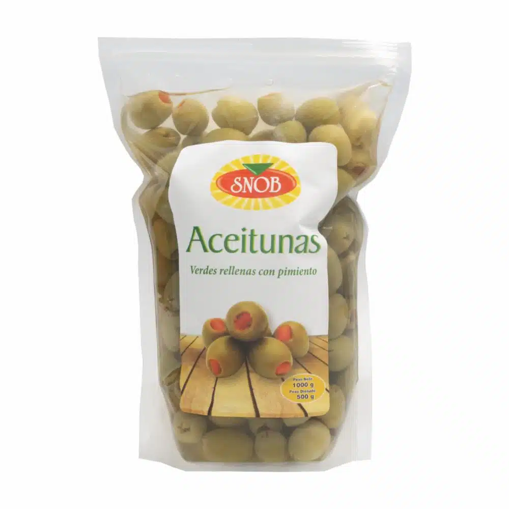 • Las aceitunas rellenas SNOB en una presentación de 1,000 g (1 kg) son un producto que consiste en aceitunas que han sido deshuesadas y rellenas con diversos ingredientes