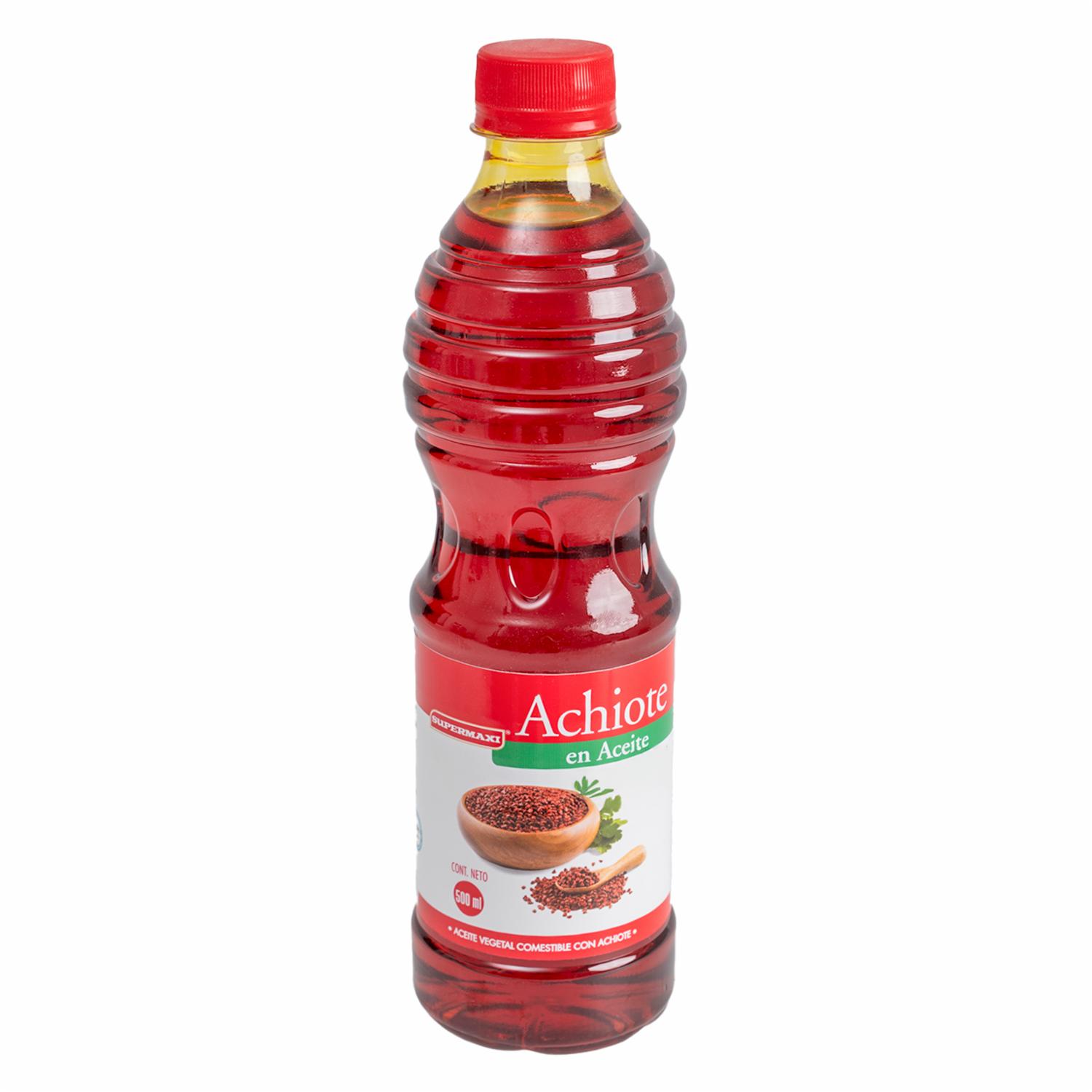 - El Achiote en Aceite SUPERMAXI es la manera más fácil de añadir color, sabor y un toque auténtico a tus platillos favoritos. Este aceite infusionado con achiote, conocido por su vibrante color rojo y su sabor suave y terroso, es ideal para aderezar, marinar o cocinar. Perfecto para darle un toque especial a arroz, carnes, sopas y guisos, haciendo que tus comidas brillen tanto en sabor como en presentación