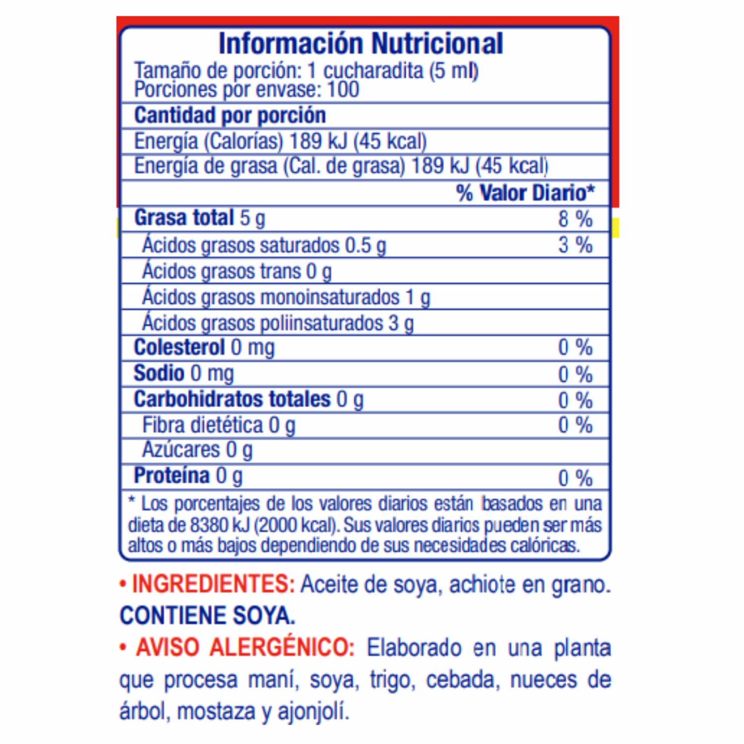 Elaborada con con aceite de soya de alta calidad. Presentación en botella de 190 ml. Aporta color intenso y sabor natural. Achiote en grano 100% natural y sin aditivos Elaborada con con aceite de soya de alta calidad