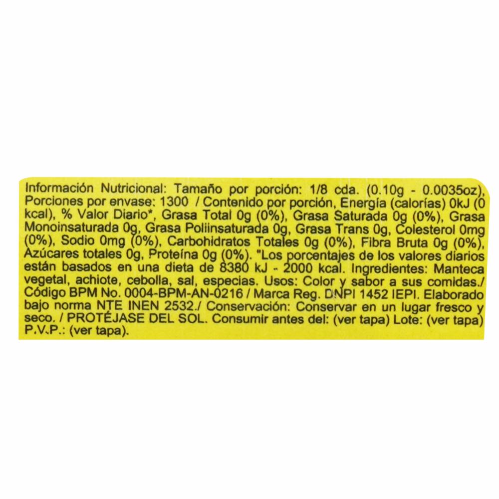 - Añade sabor y color a las comidas. - Constituido principalmente por achiote en polvo, sal, especias y otros ingredientes. - Se puede utilizar en la preparación de todo tipo de platillos, especialmente en la cocina latinoamericana y caribeña. . - Puede ser utilizado tanto en carnes, como en verduras y arroces. . - Es un producto de larga duración y fácil de almacenar