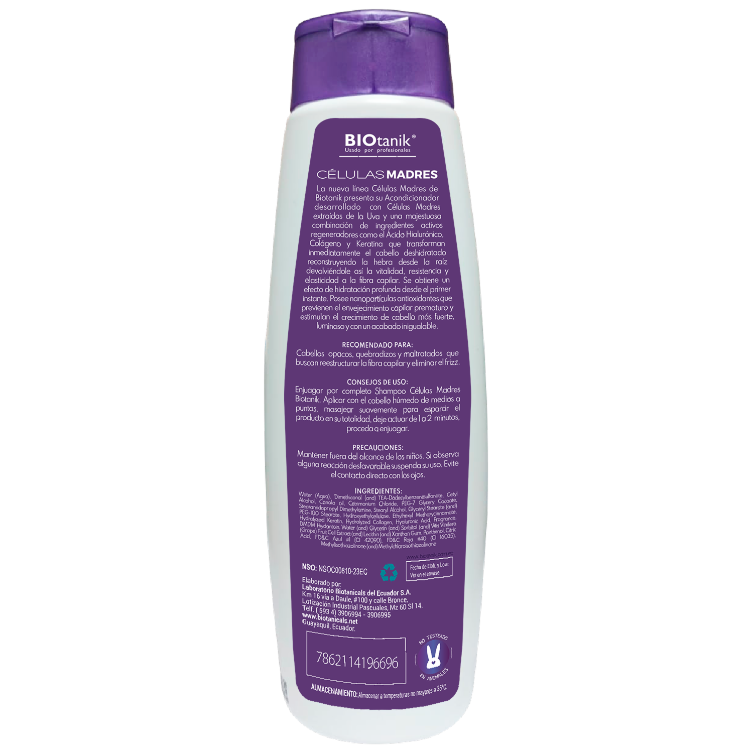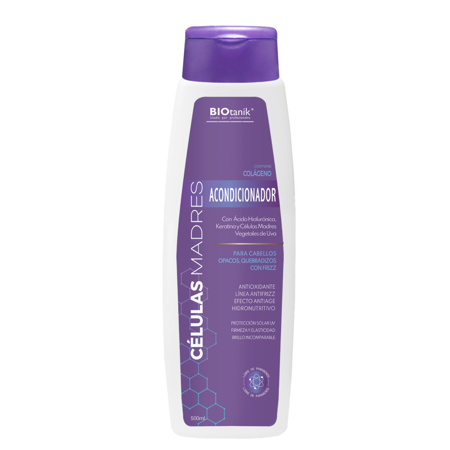 - La nueva línea Células Madres de Biotanik presenta su Acondicionador desarrollado con Células Madres extraídas de la Uva y una majestuosa combinación de ingredientes activos regeneradores como el Ácido Hialurónico, Colágeno y Keratina que transforman inmediatamente el cabello deshidratado reconstruyendo la hebra desde la raíz devolviéndole así la vitalidad, resistencia y elasticidad a la fibra capilar