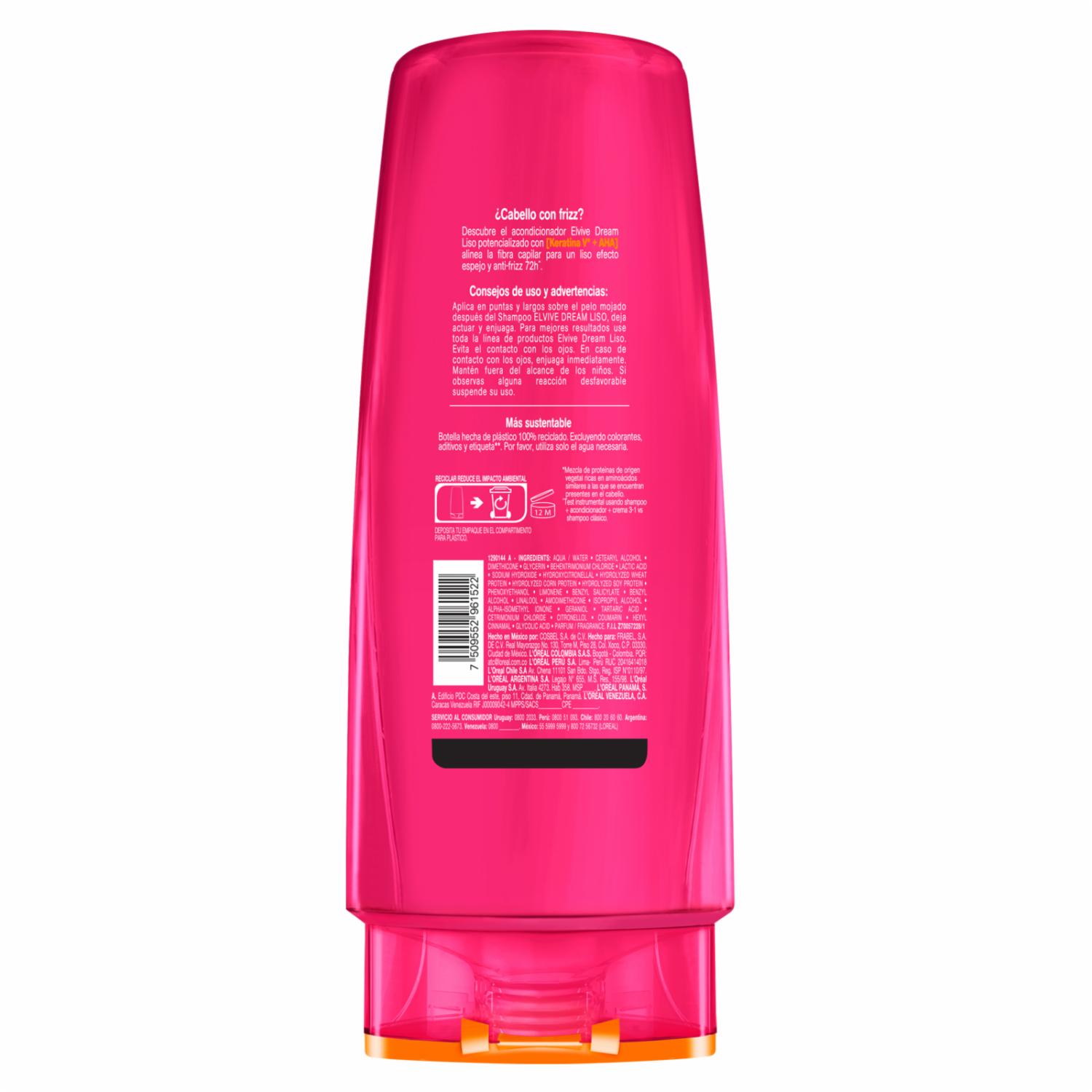 Acondicionador Elvive Dream Liso con Keratina Vegetal más AHA (Alpha silane) activada por el calor para cabello con frizz. Anti-Frizz 72H. Cabello 4X más suave. Aplicar de puntas a largos sobre el pelo mojado después del shampoo brillo 72 h, dejar actuar y enjuagar