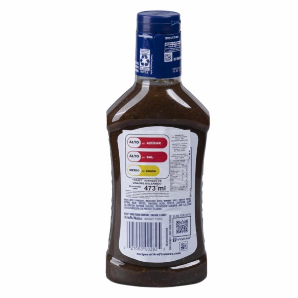 El Aderezo para Ensalada de Vinagre Balsámico de Kraft, en su presentación de 473 ml, es un aderezo popular y ampliamente utilizado que combina el sabor dulce y ácido del vinagre balsámico con otros ingredientes, como aceite de soja, azúcar, especias y condimentos, para crear un sabor equilibrado y delicioso