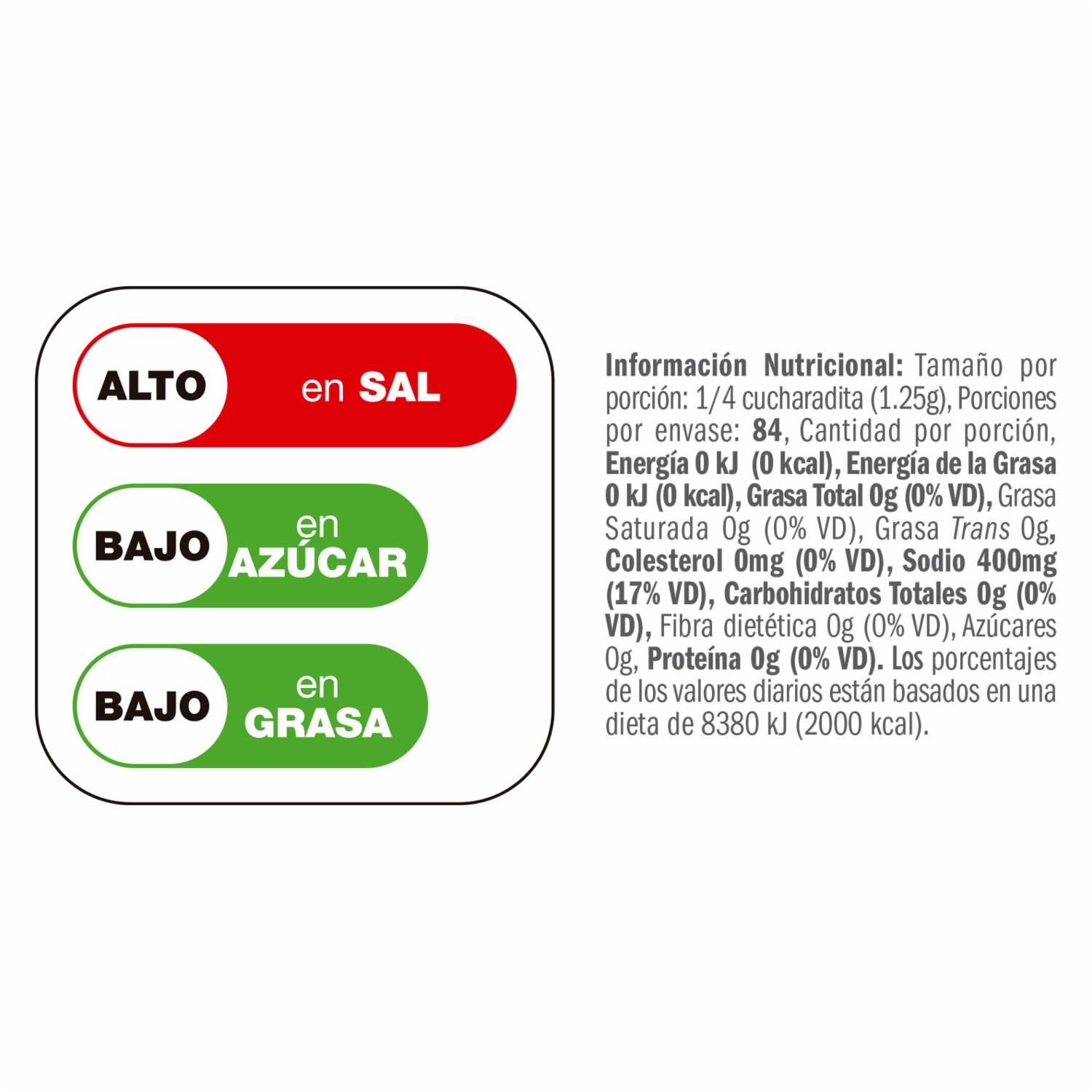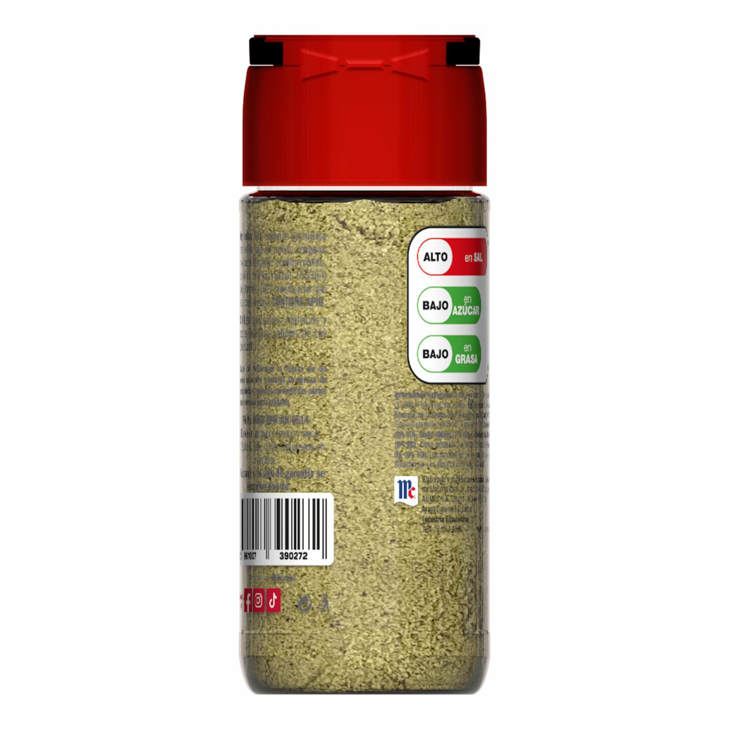 - Mezcla en polvo de especias naturales: pimienta negra, orégano, ajo, cebolla, apio, comino y pimentón