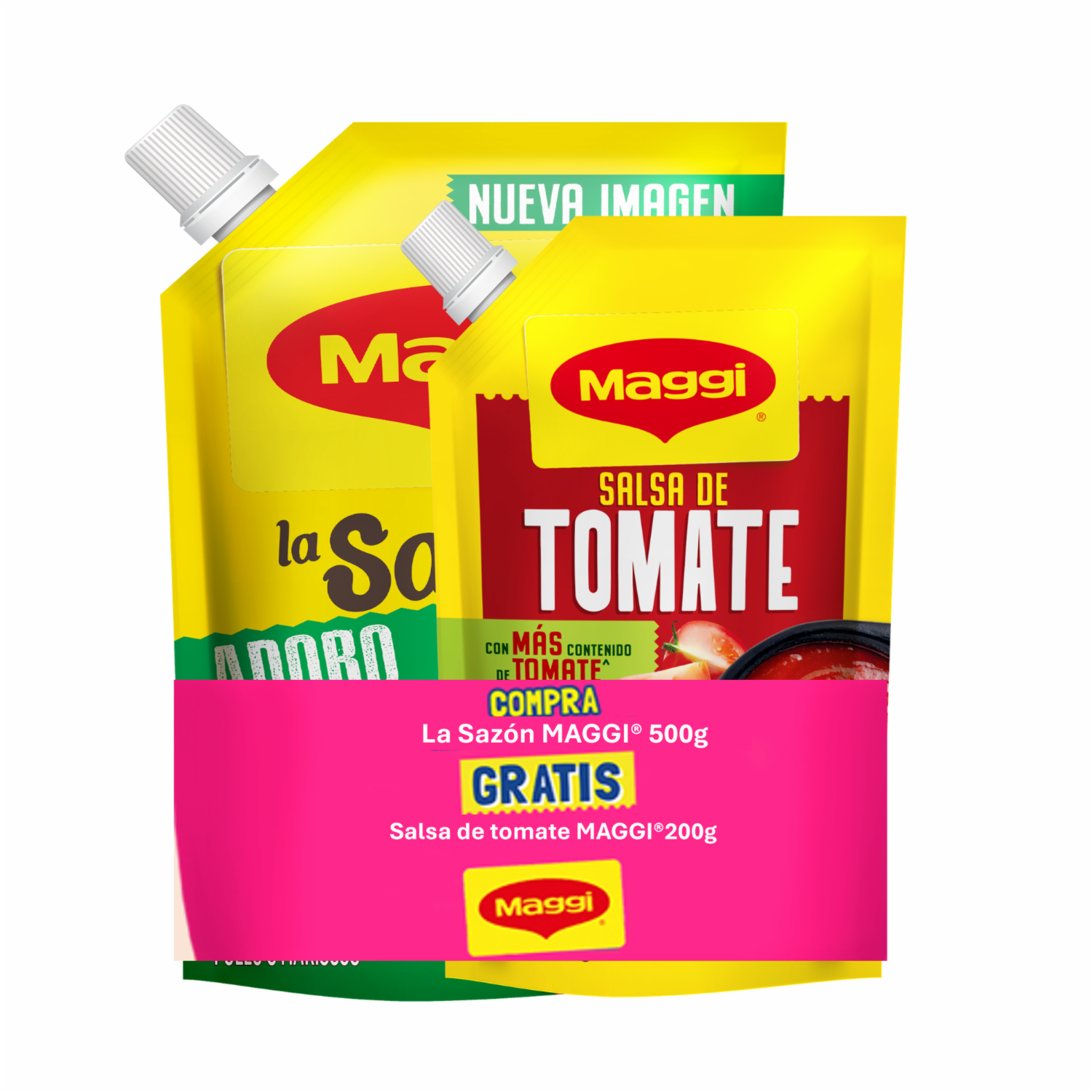 - Disfruta el equilibrio perfecto entre sabor y practicidad. La Sazón, un adobo completo con un toque de mostaza, realza carnes y comidas en minutos. Acompáñalo con la Salsa de Tomate MAGGI®,elaborada con más contenido de tomate para darle ese sabor ideal a tus comidas. Un dúo ideal para transformar tus recetas de forma fácil y rápida