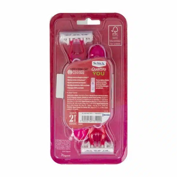 • La Afeitadora para Dama Quattro You Raspberry SCHICK viene en un set de 2 unidades, diseñada para ofrecer una experiencia de afeitado suave y cómoda