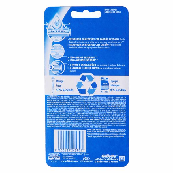 • Características - Tres hojas para un afeitado al ras - Cabezal flexible que se ajusta al rostro - Banda lubricante con tecnología Comfortgel - Hojas con carbón activado para mayor limpieza - Mango ergonómico antideslizante