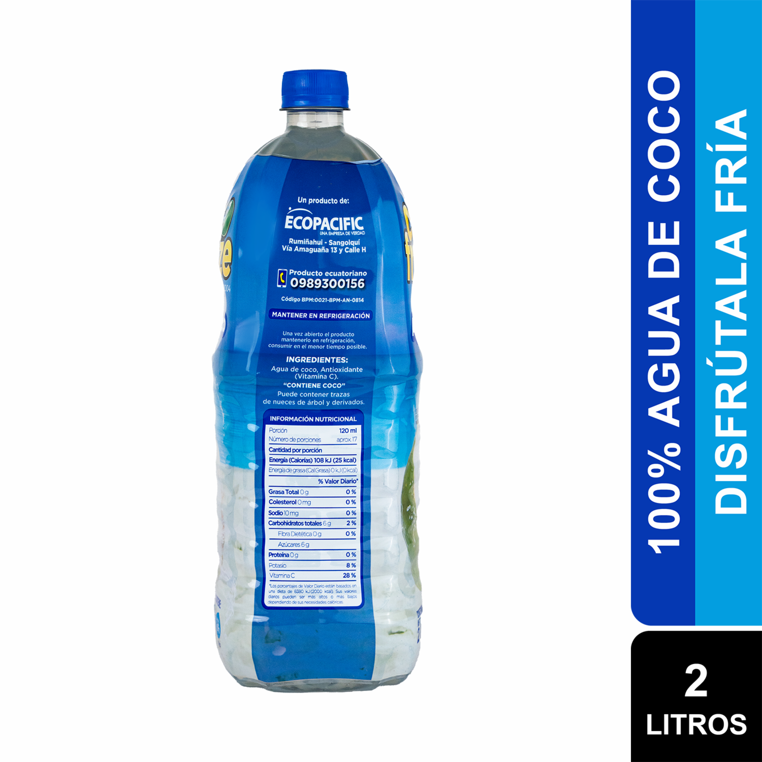 - Agua de coco natural en presentacion de dos litros, elaborada con cocos frescos manabitas sin conservantes ni colorantes artificiales. Fuente natural de hidratacion y electrolitos que ayudan a reponer minerales de forma saludable. Producto 100 por ciento natural y sin azucares añadidos. Ideal para compartir en familia, comidas o despues del ejercicio. Servir bien fria para disfrutar su sabor autentico y tropical
