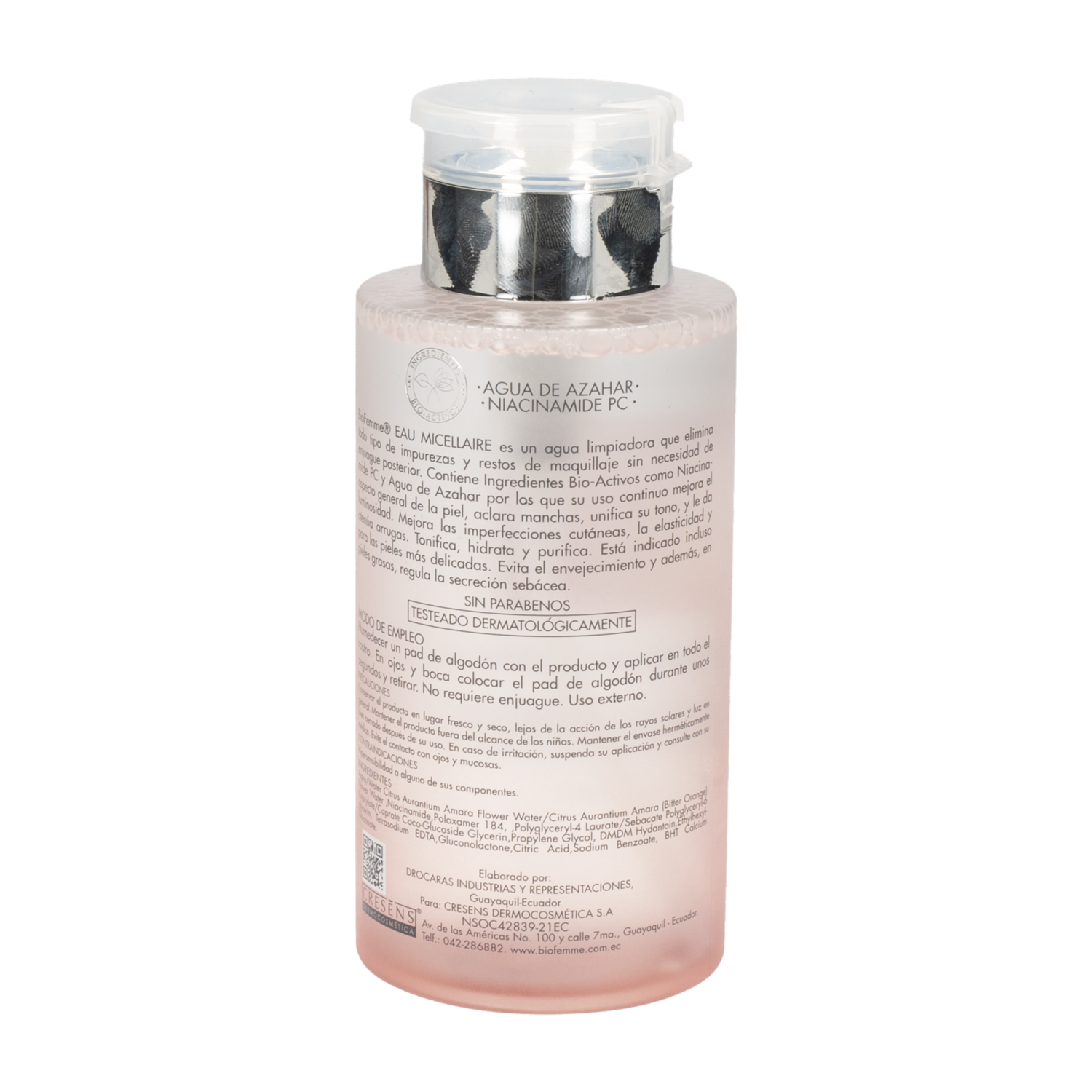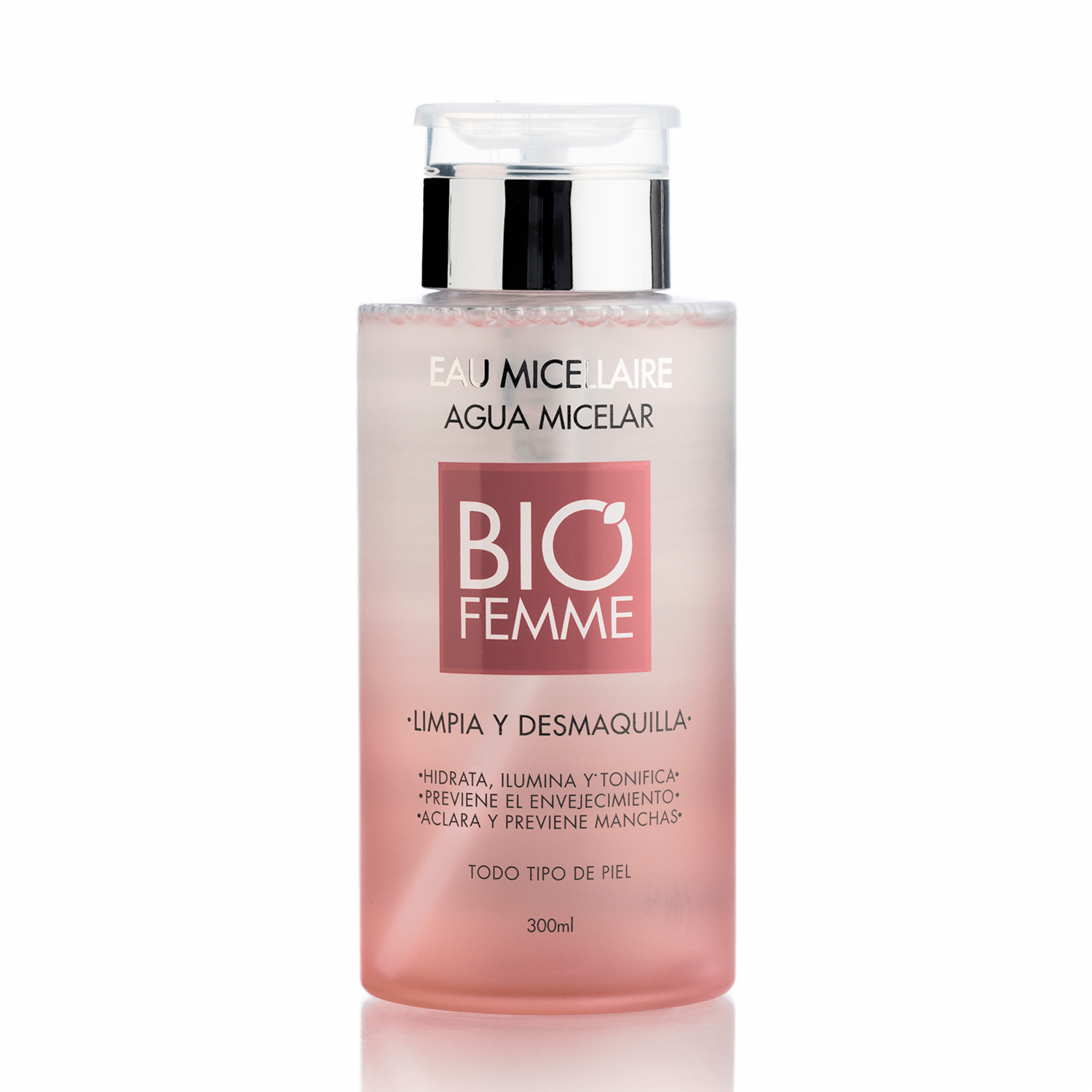 - BioFemme® EAU MICELLAIRE es un agua limpiadora única con propiedades extraordinarias que elimina todo tipo de impurezas y restos de maquillaje sin necesidad de enjuague posterior. Contiene activos, entre ellos Niacinamide PC, que hacen que su uso continuo mejore el aspecto general de la piel, ayudando a aclarar las manchas, unificando el tono de la piel, y dándole luminosidad. También mejora las imperfecciones cutáneas, la elasticidad y las arrugas