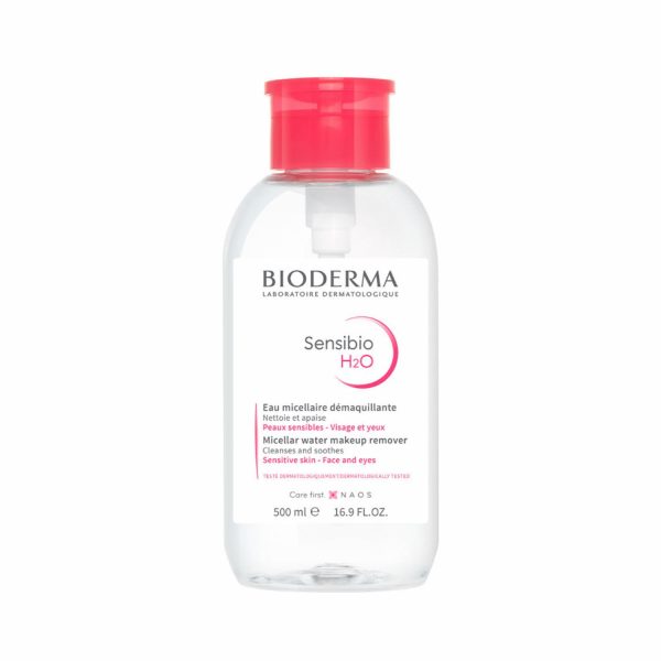 • El agua micelar Sensibio H2O con dispensador de Bioderma es un producto de limpieza facial suave que está especialmente formulado para pieles sensibles. Sus micelas actúan como imanes para atraer y eliminar suavemente la suciedad, el maquillaje y las impurezas de la piel sin irritarla