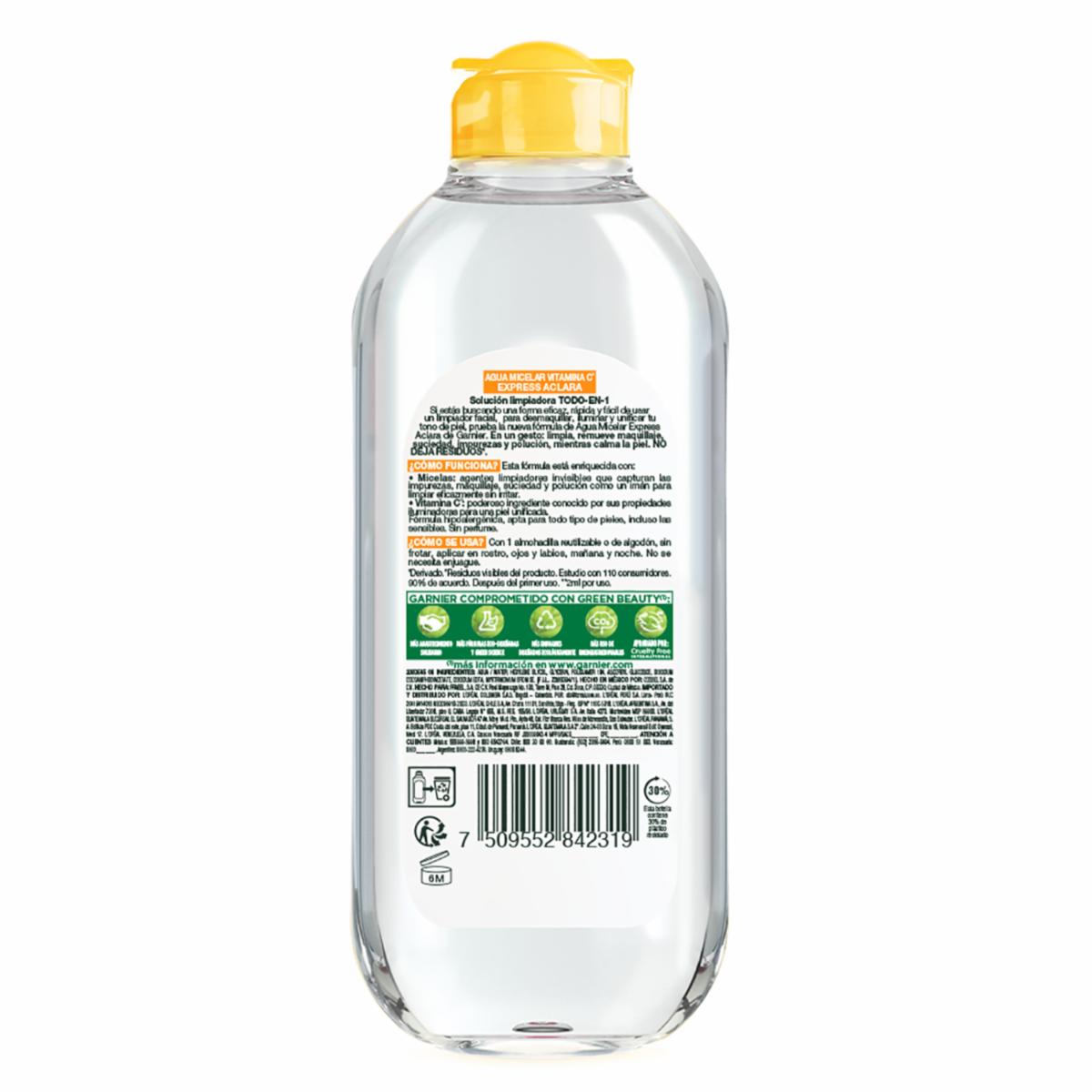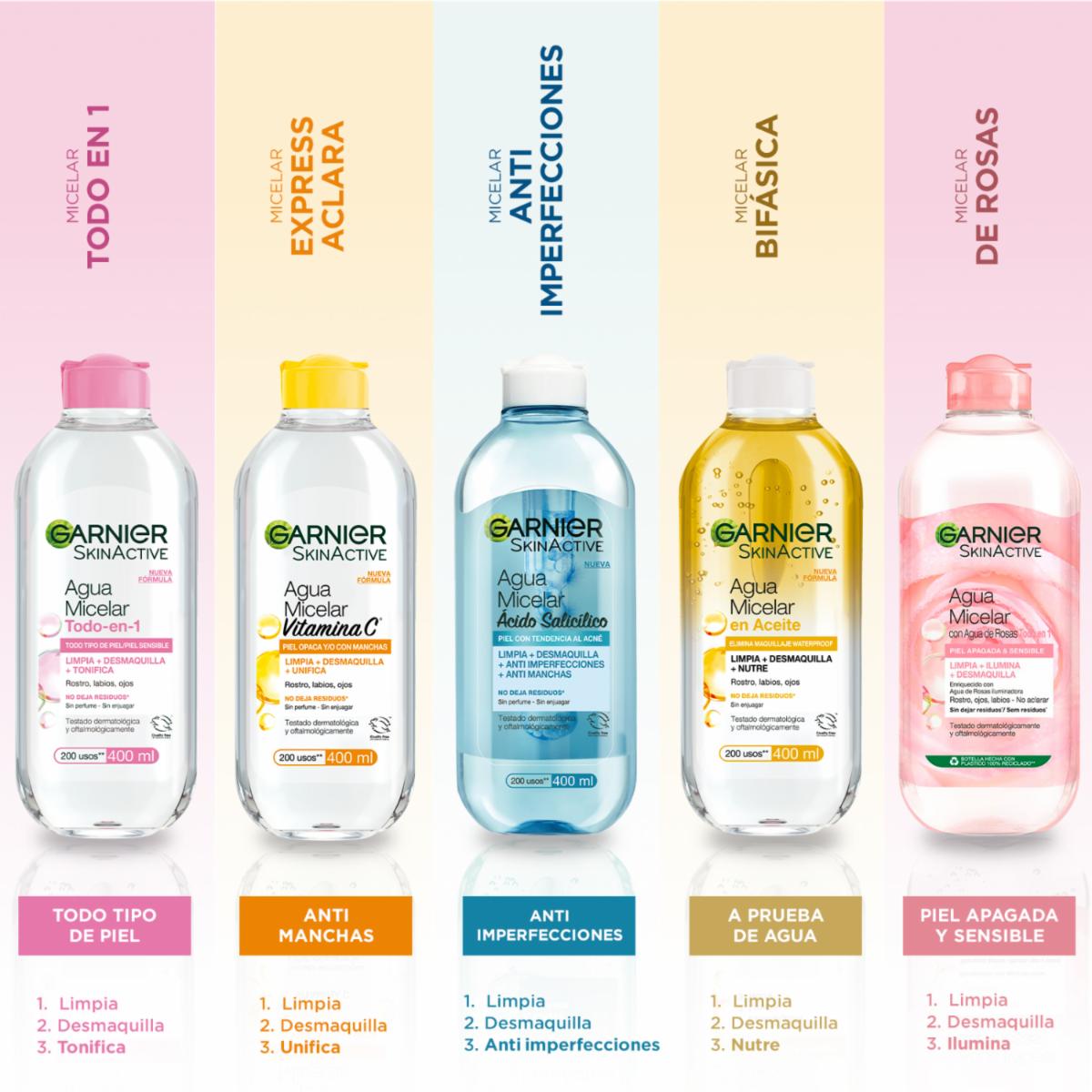 - El Agua Micelar Express Aclara de Garnier: Desmaquilla, Limpia y Unifica el tono de la piel del rostro, la piel permace hidratada hasta 4 horas despues de usar el producto.