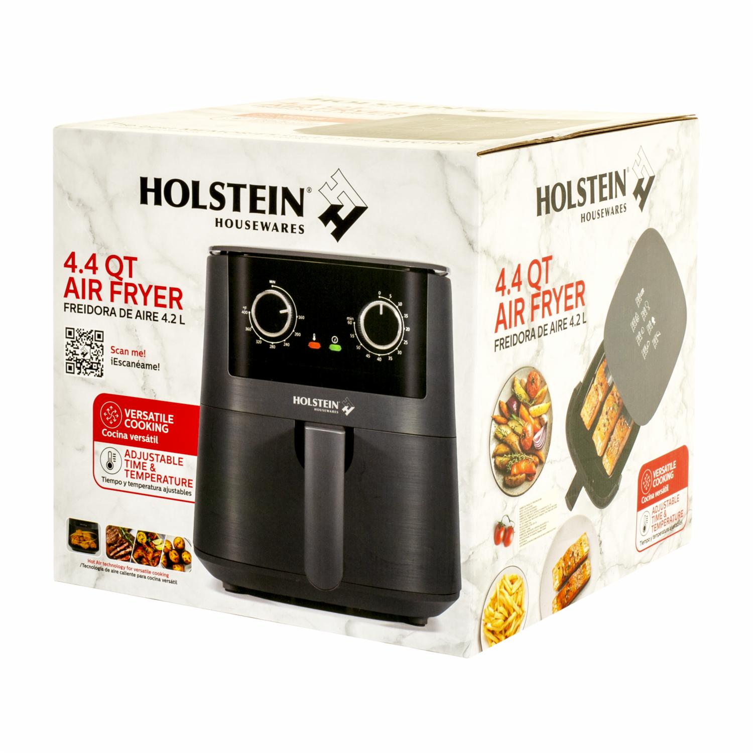 • Freidora de aire análoga 4,2 lt Holstein. Su tecnología Air cocina los alimentos haciendo circular aire caliente en todas direcciones, lo que garantiza una cocción rápida y uniforme, mientras que funciones como precalentar, mantener caliente y agitar añaden comodidad al proceso de cocción