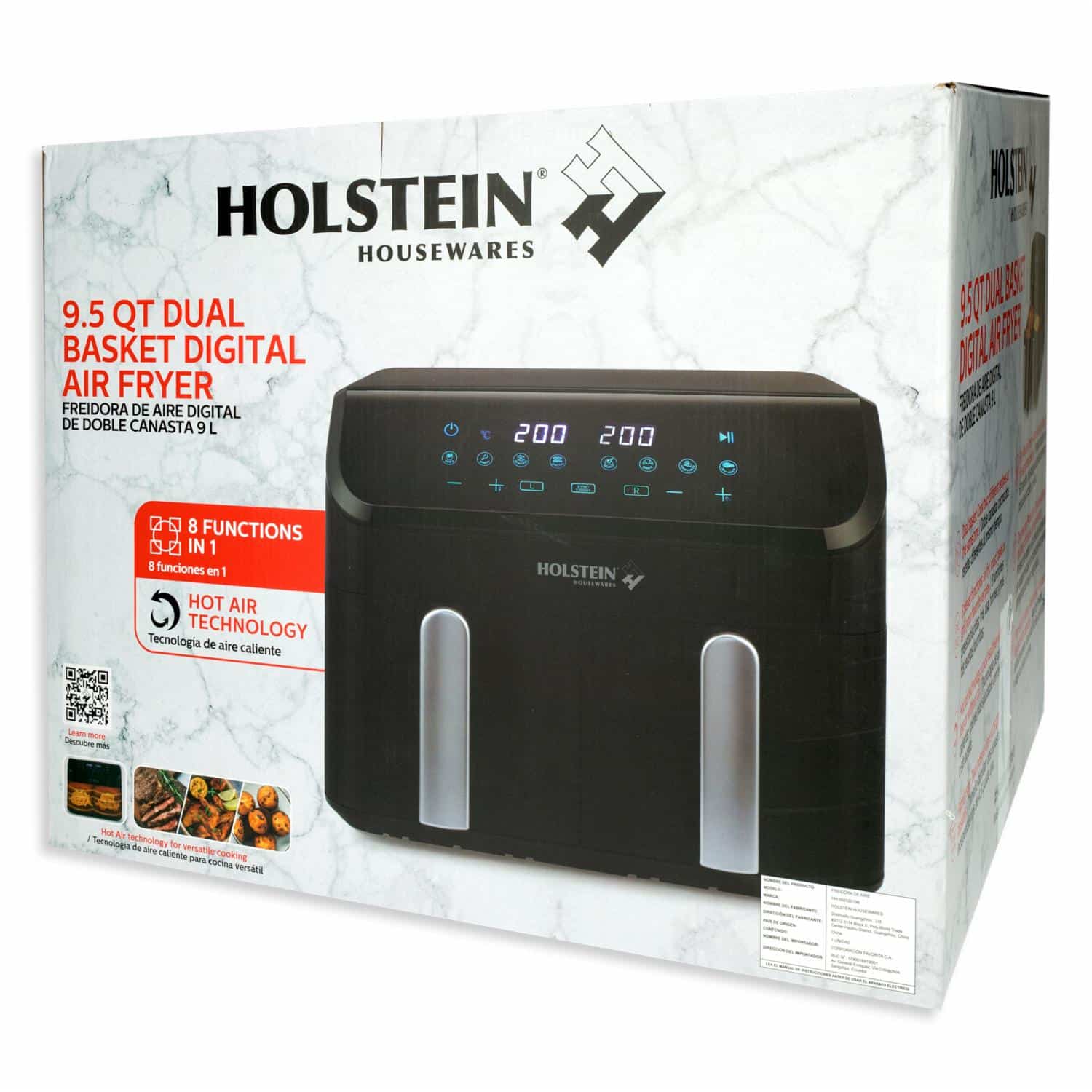 Con la freidora digital Holstein Housewares de 9,5 cuartos de galón con doble cesta, ¡Saborea tus platos favoritos con menos o sin aceite! Su tecnología de aire caliente cocina los alimentos haciendo circular aire caliente en todas las direcciones, lo que garantiza una cocción rápida y uniforme. Características: - Modelo: HH-09202019B - Cuenta con dos cestas de 4,75 Litros control independiente. - Temporizador de apagado automático - Permite freír, hornear, asar
