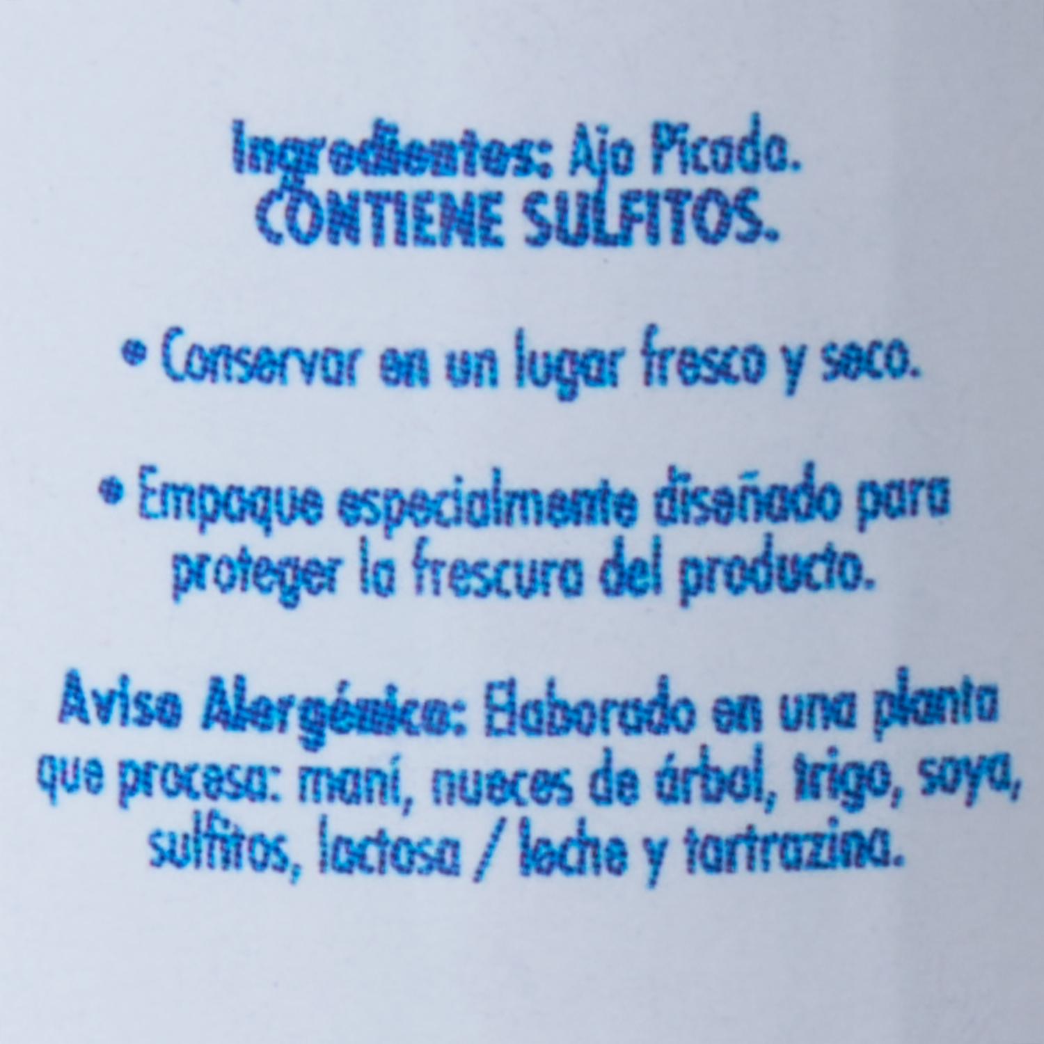 - Ajo picado listo para usar que facilita la preparación de tus platillos favoritos. Aporta sabor intenso y fresco sin necesidad de pelar o picar. Ideal para cocinar rápido y con sabor auténtico.