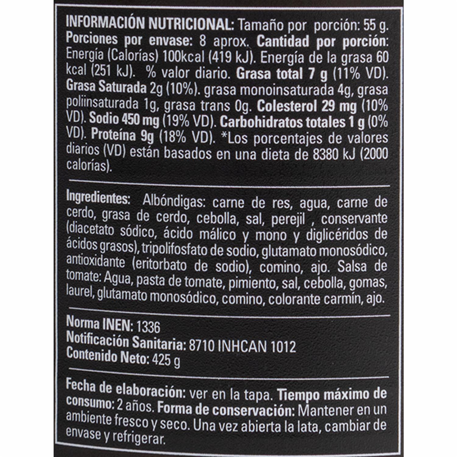 - Albóndigas de carne en salsa de tomate listo para servirse sin preservantes ni colorantes