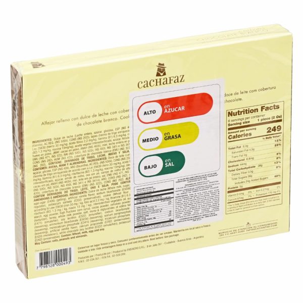 - El producto es un alfajor de chocolate blanco relleno. - Viene en un paquete de 6 unidades. - La marca del producto es Cachafaz