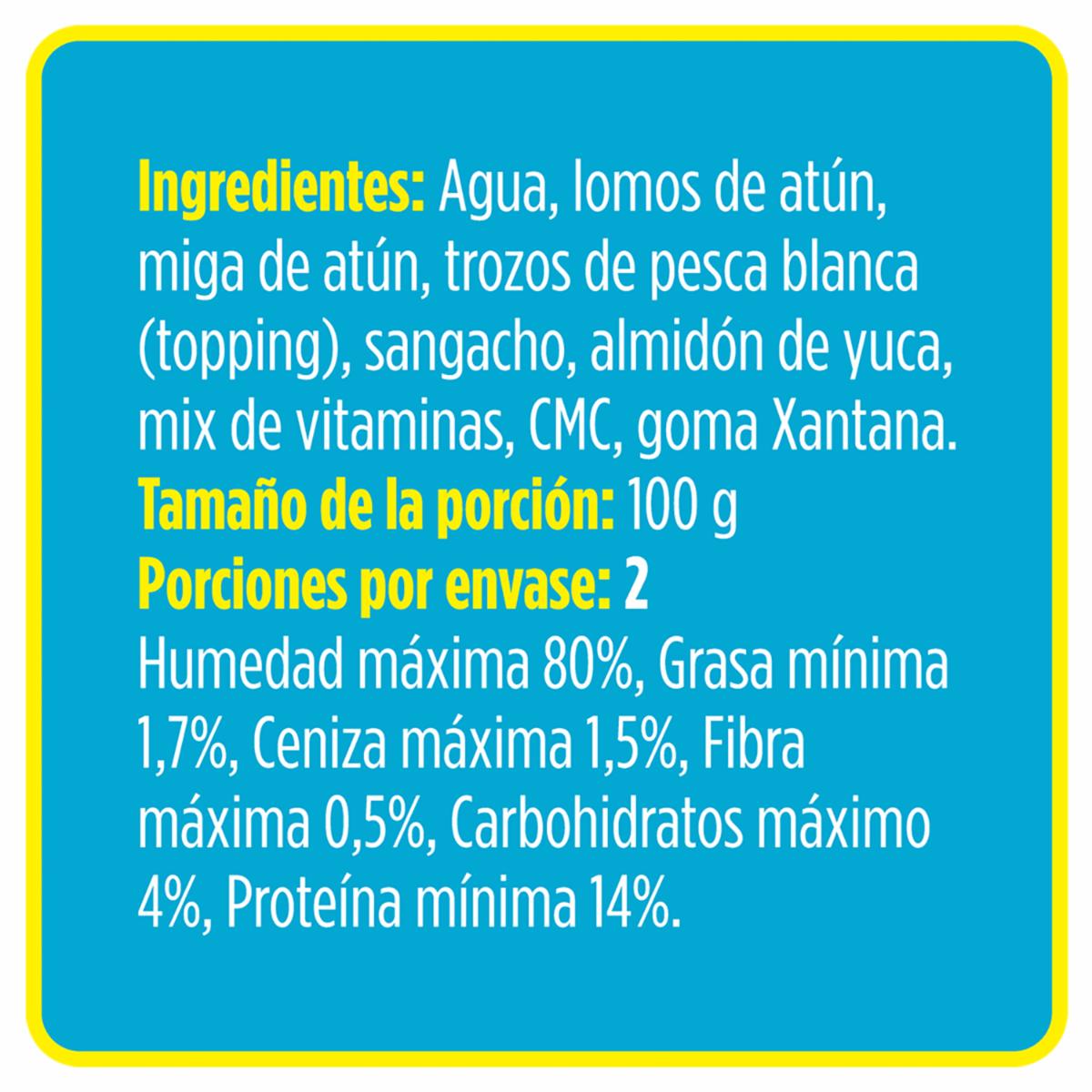 - Alimento para gatos hecha con atún y pesca blanca para brindar a tu mascota los nutrientes, vitaminas y minerales que necesita