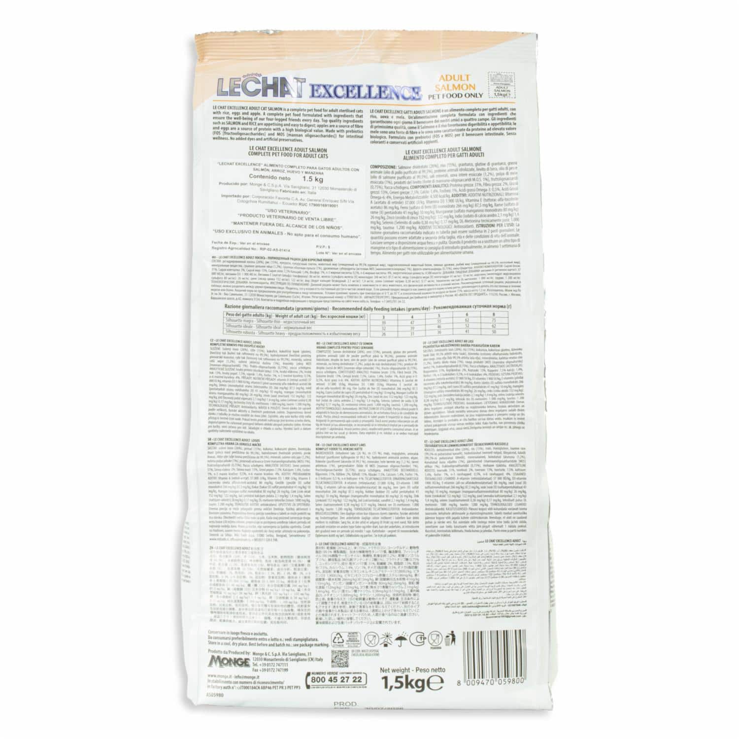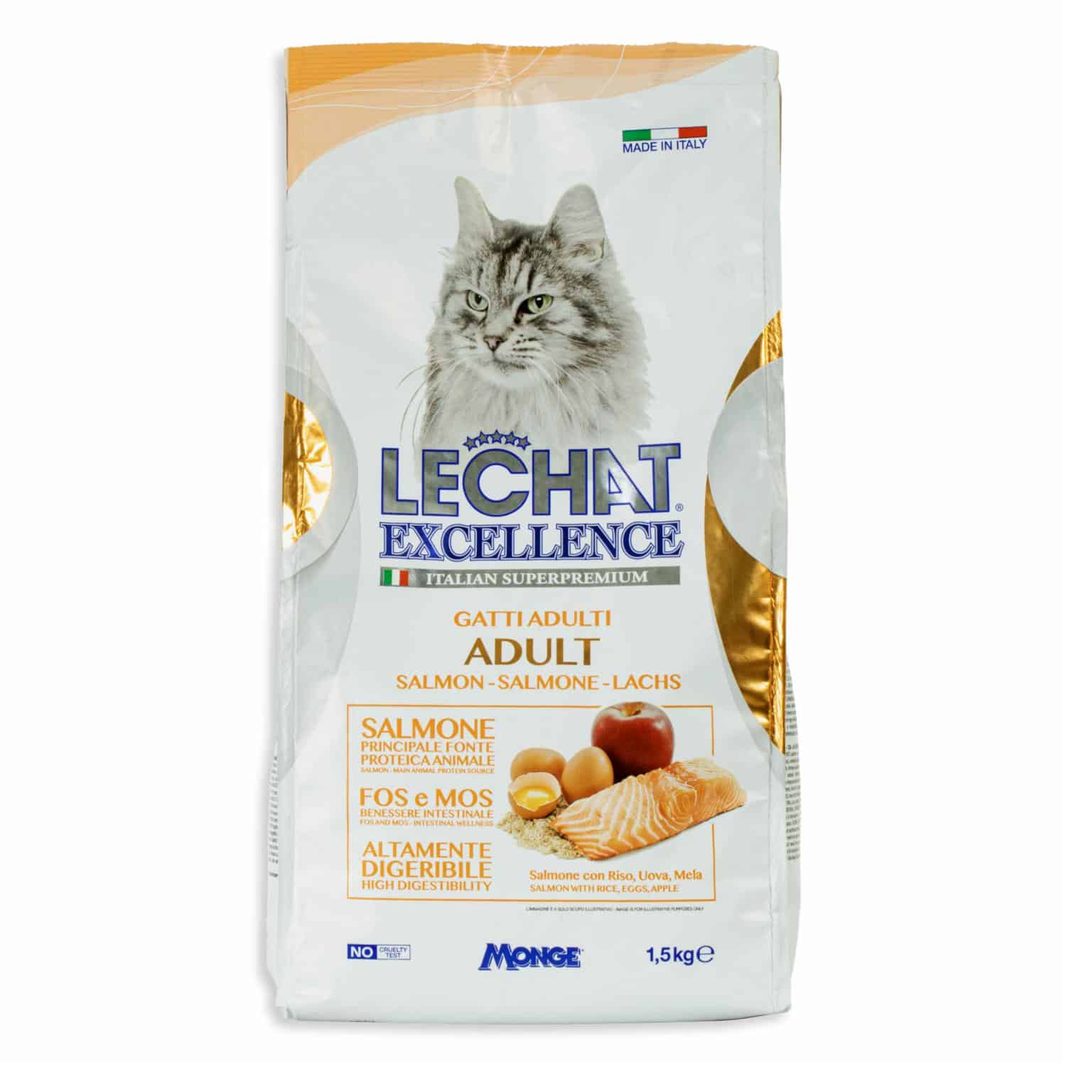 • Le Chat Excellence Adult Cats Salmón es un alimento completo para gatos adultos, con arroz, huevos y manzana. Una dieta completa formulada con ingredientes que garantizan el bienestar de nuestros amigos de cuatro patas cada día