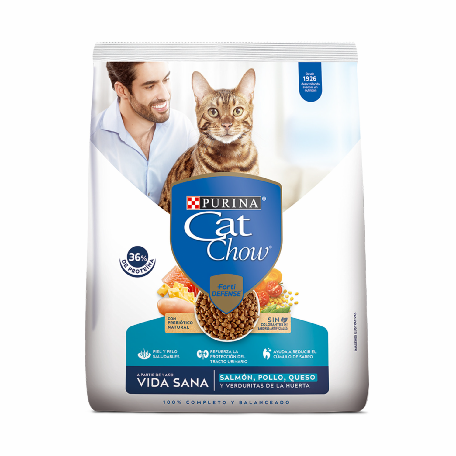 - Purina Cat Chow, alimento concentrado para gatos adultos cuya fórmula está enfocada en aportar un balance óptimo de nutrientes e ingredientes que contribuirán a llevar una vida sana, llena de energía y feliz