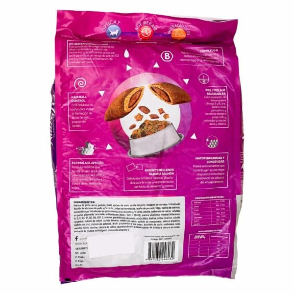 Este alimento para gatos adultos se presenta en forma de nuggets, que son pequeños trozos de comida que son fáciles de comer y digerir. Está formulado para satisfacer las necesidades nutricionales de los gatos adultos y suele ser una opción sabrosa
