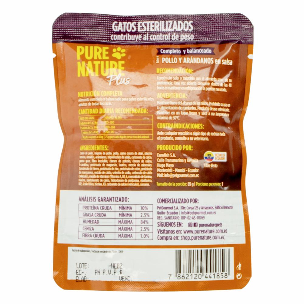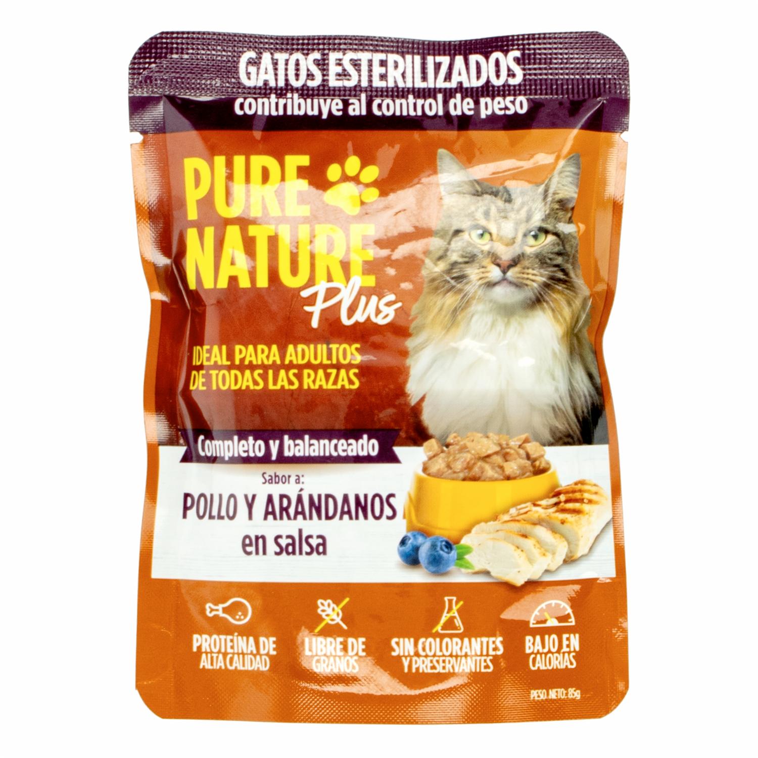 Alimento Para Gatos Plus Esterilizado Sabor A Pollo Y Arándanos PURE NATURE 85 G