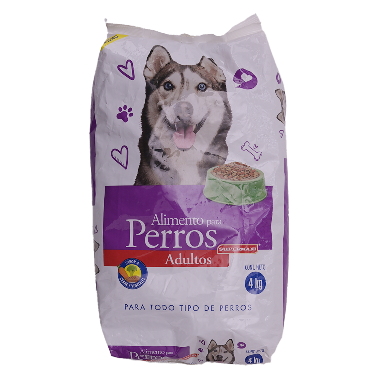 - Nutrición completa y sabor que encanta. El alimento para perro adulto SUPERMAXI combina carne y vegetales para ofrecer una dieta balanceada que fortalece músculos y mejora la digestión. Perfecto para mantener a tu peludo lleno de energía y buen ánimo. Su presentación de 4 kg es ideal para hogares con un amigo de cuatro patas muy especial