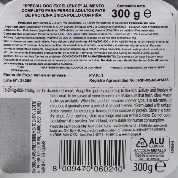 • La línea especial excelencia canina se completa con patés de frutas, preciosas recetas de frutas pensadas para perros de todas las razas y edades. La fórmula contiene carne de pollo 100% italiano seleccionada y altamente digestible. Además está enriquecido con Piña ricas en vitaminas y la frescura natural de la fruta
