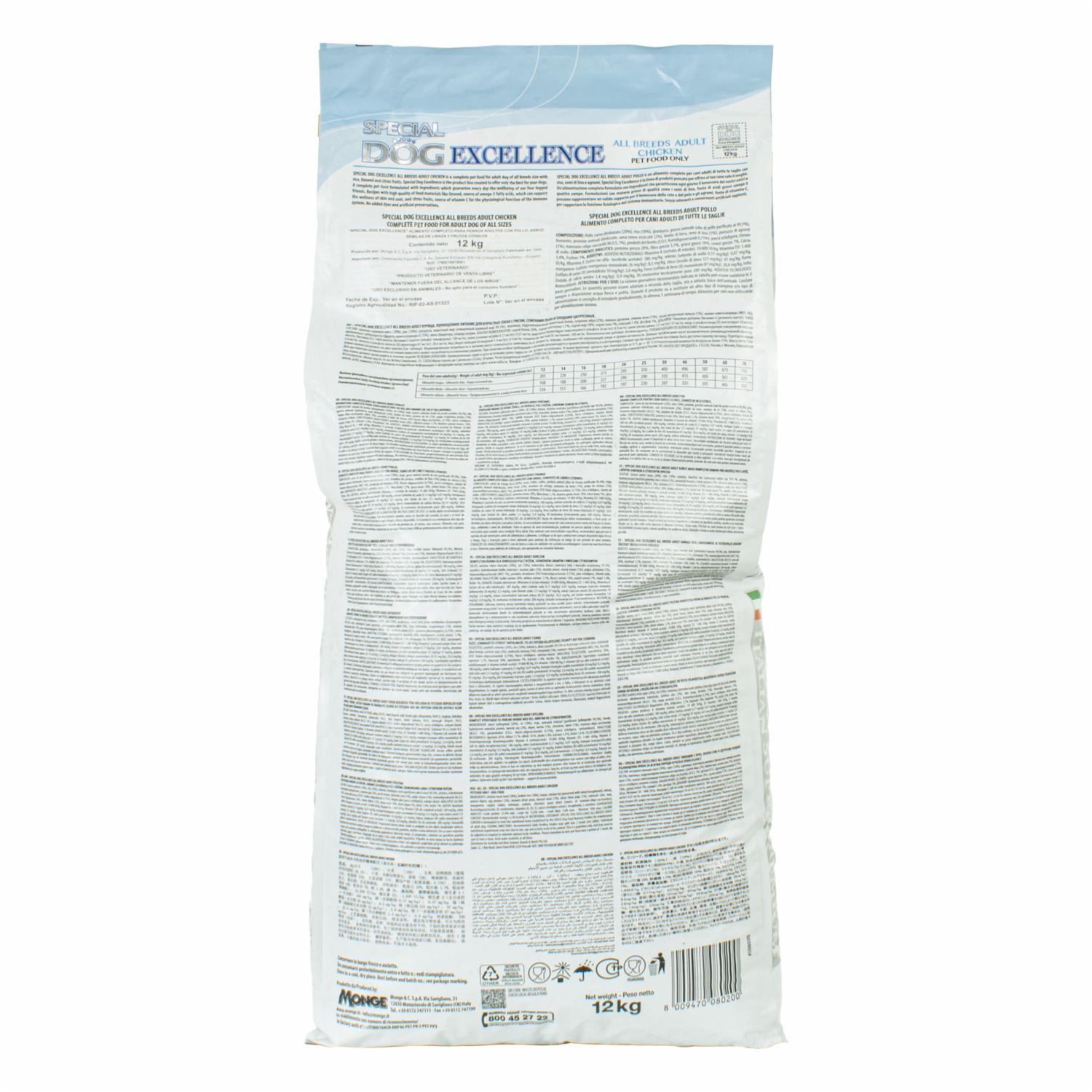 - Special Dog Excellence All Breeds Adult Chicken es un alimento completo para perros adultos de todos los tamaños con arroz, linaza y frutas cítricas. Special Dog Excellence es la línea de productos creada para ofrecer sólo lo mejor para tus perros. Un alimento completo para mascotas con ingredientes que garantizan el bienestar diario de nuestros amigos de cuatro patas