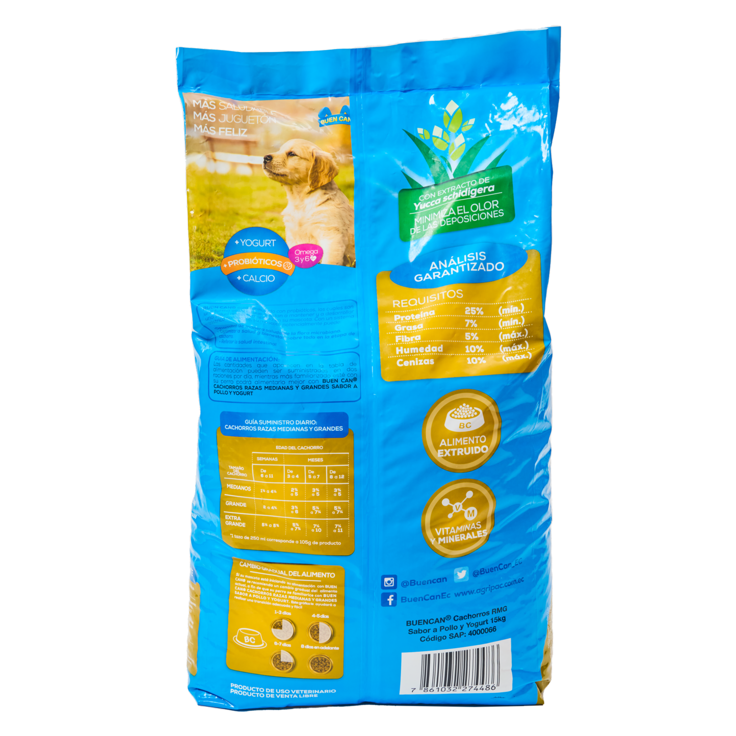 - Alimento completo para cachorros de razas medianas y grandes contiene Omega 3 y 6, Calcio y Yogurt