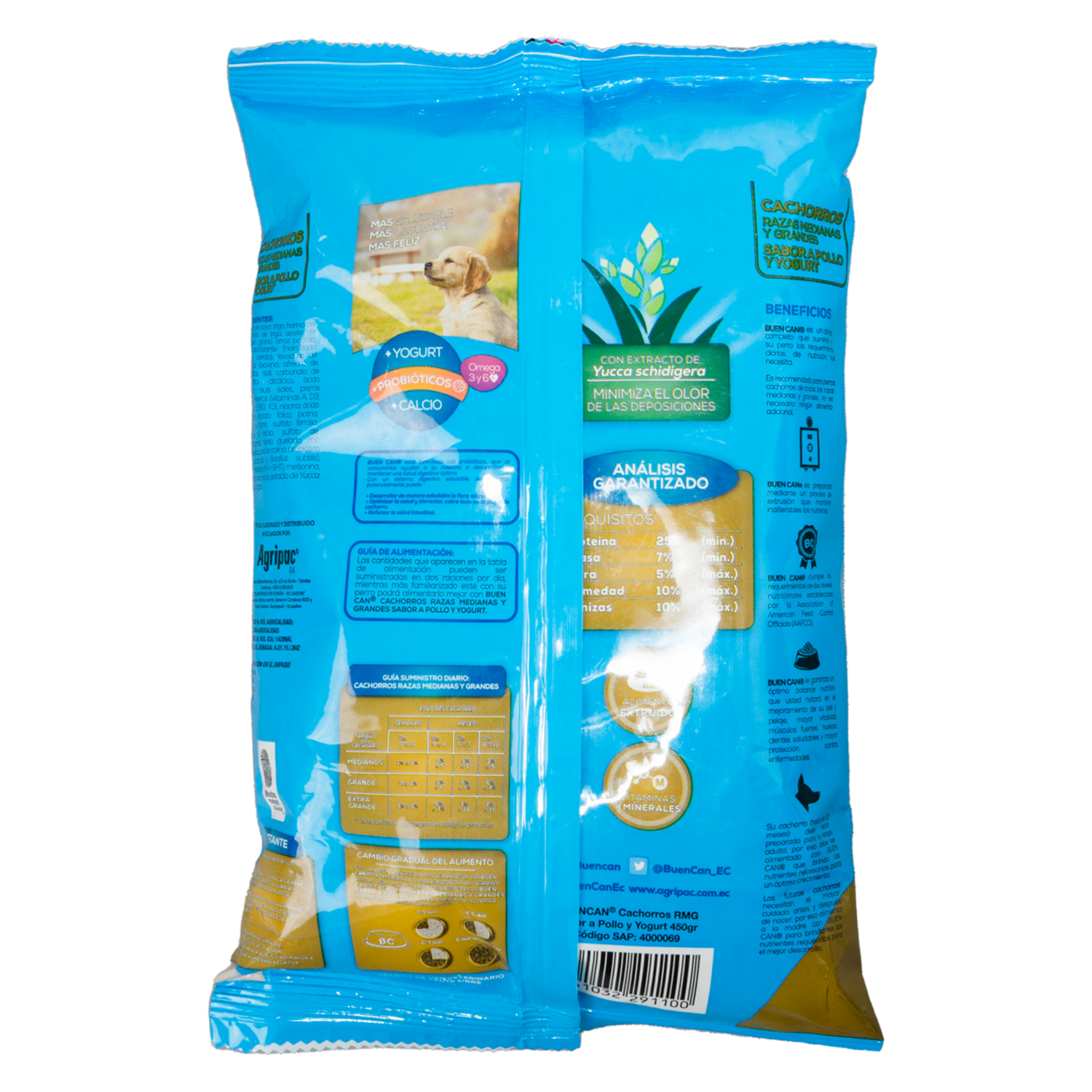 Producto de comida diseñada específicamente para cachorros de la marca "BUEN CAN" en una presentación de 450 gramos,formulada con sabor a pollo y yogurt la hace atractiva para los cachorros en términos de sabor y aroma