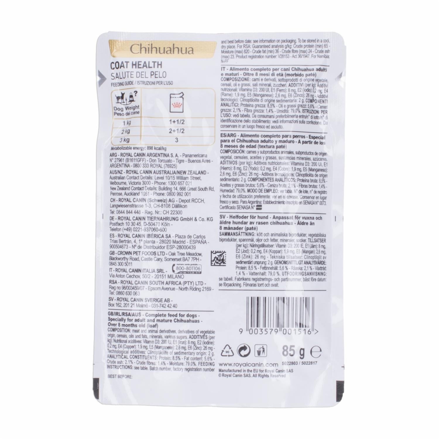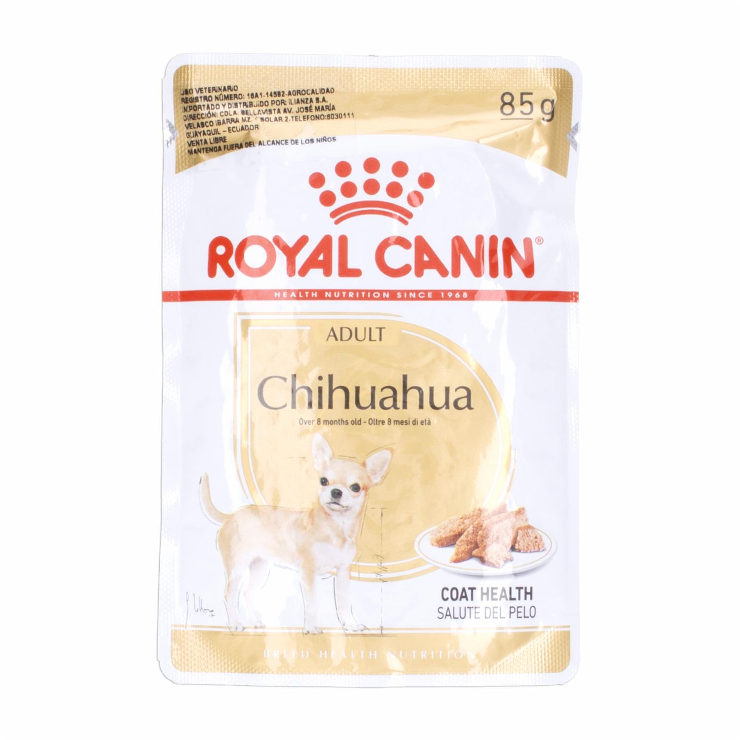 • La "Comida Para Perros Chihuahua Adult ROYAL CANIN 85 g" es un tipo de alimento húmedo diseñado específicamente para perros adultos de la raza Chihuahua