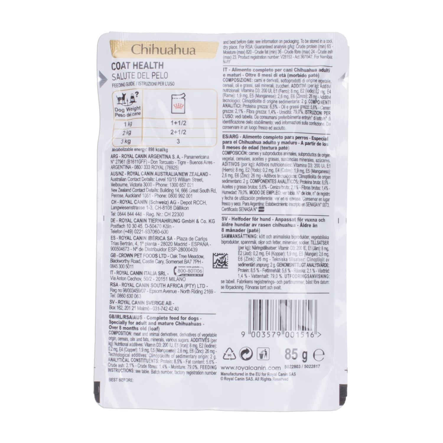 - La "Comida Para Perros Chihuahua Adult ROYAL CANIN 85 g" es un tipo de alimento húmedo diseñado específicamente para perros adultos de la raza Chihuahua