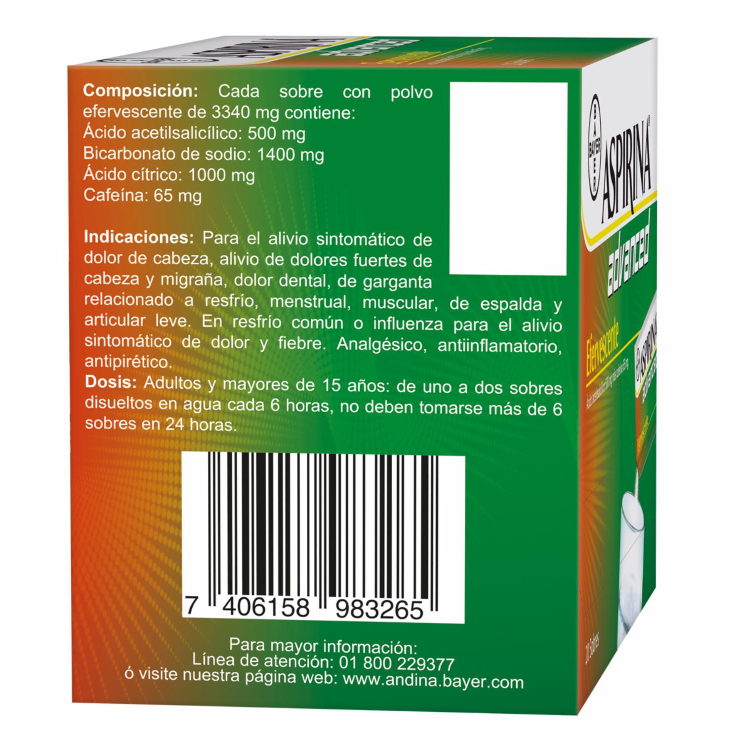 Aspirina® Advanced En Sobres Efervescentes Para Un Alivio Rápido Y Efectivo. Gracias A Su Rápida Absorción, Brinda Un Alivio Rápido Y Eficaz Del Dolor De Cabeza, Migraña Y Fiebre