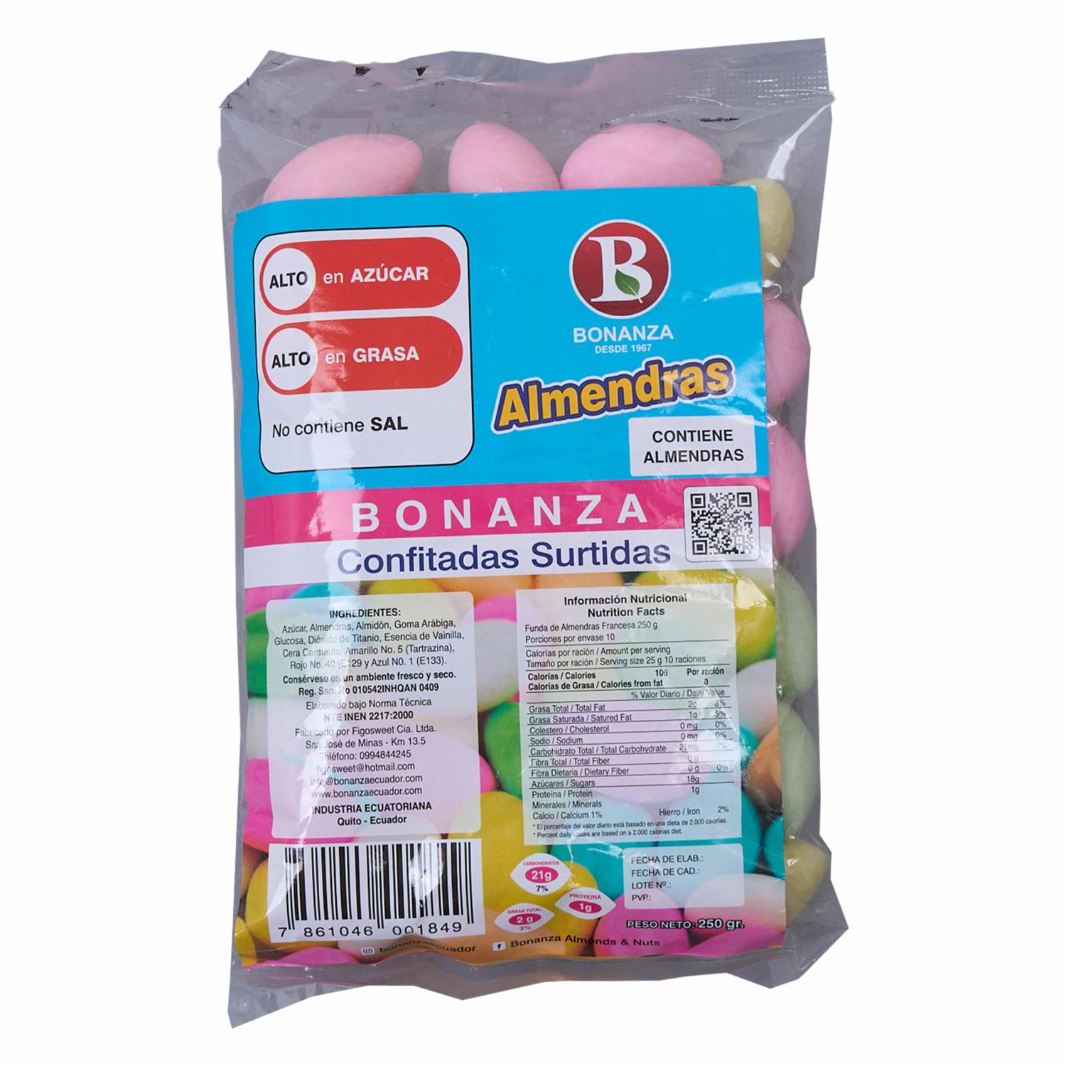 - Almendra finamente confitada con azúcar de caña y vainilla francesa. Estas pueden ser color blanco o variedad de colores pasteles como celeste, amarillo, rosado y verde