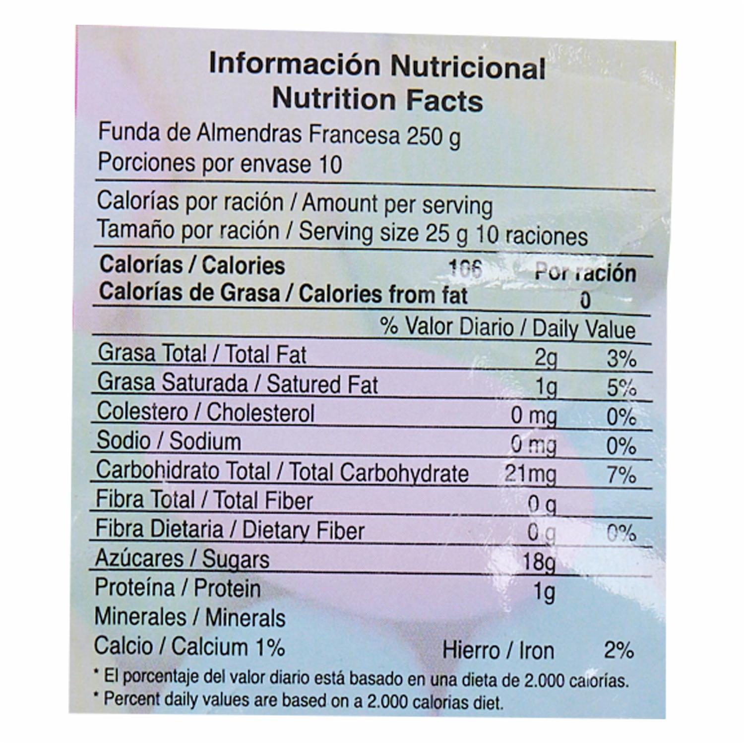 consultando preciosAlmendra Francesa BONANZA 250 G – BONANZA. Disponible en nuestros locales. Precio y stock pueden variar según la tienda.
