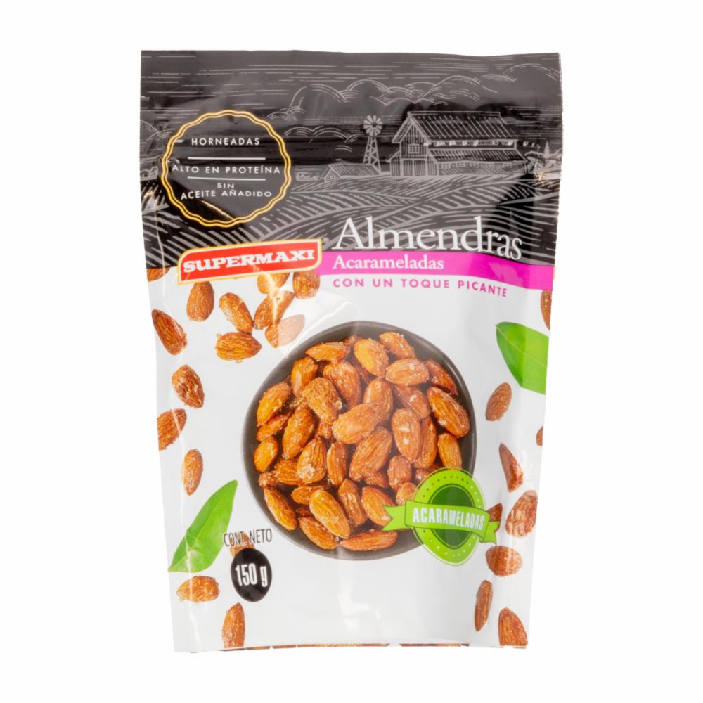 - Las Almendras Acarameladas SUPERMAXI 150 g son un delicioso snack que combina la suavidad y el sabor natural de las almendras con un toque dulce y crujiente gracias a la capa de caramelo. Cada almendra está recubierta con una capa fina de caramelo que resalta su sabor, ofreciendo una experiencia dulce y salada al mismo tiempo