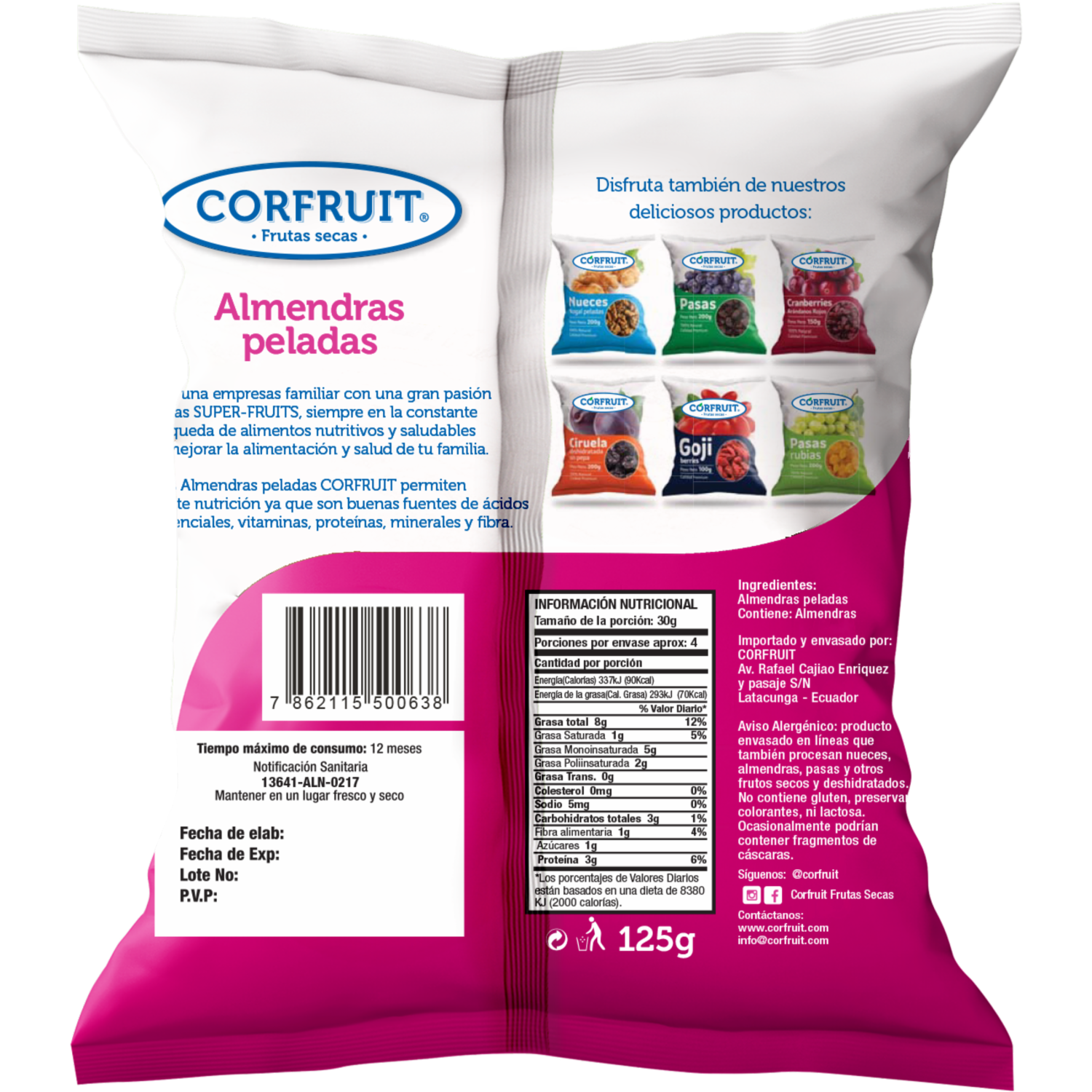 - Deléitate con la frescura y el sabor puro de nuestras almendras peladas CORFRUIT. Cultivadas con cuidado y seleccionadas meticulosamente, estas almendras son un bocadillo nutritivo y delicioso para satisfacer tus antojos saludables
