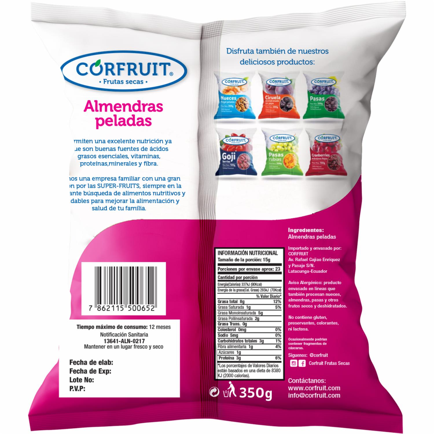 Almendras Peladas 100% Natural CORFRUIT 350 G – CORFRUIT. Disponible en nuestros locales. Precio y stock pueden variar según la tienda.
