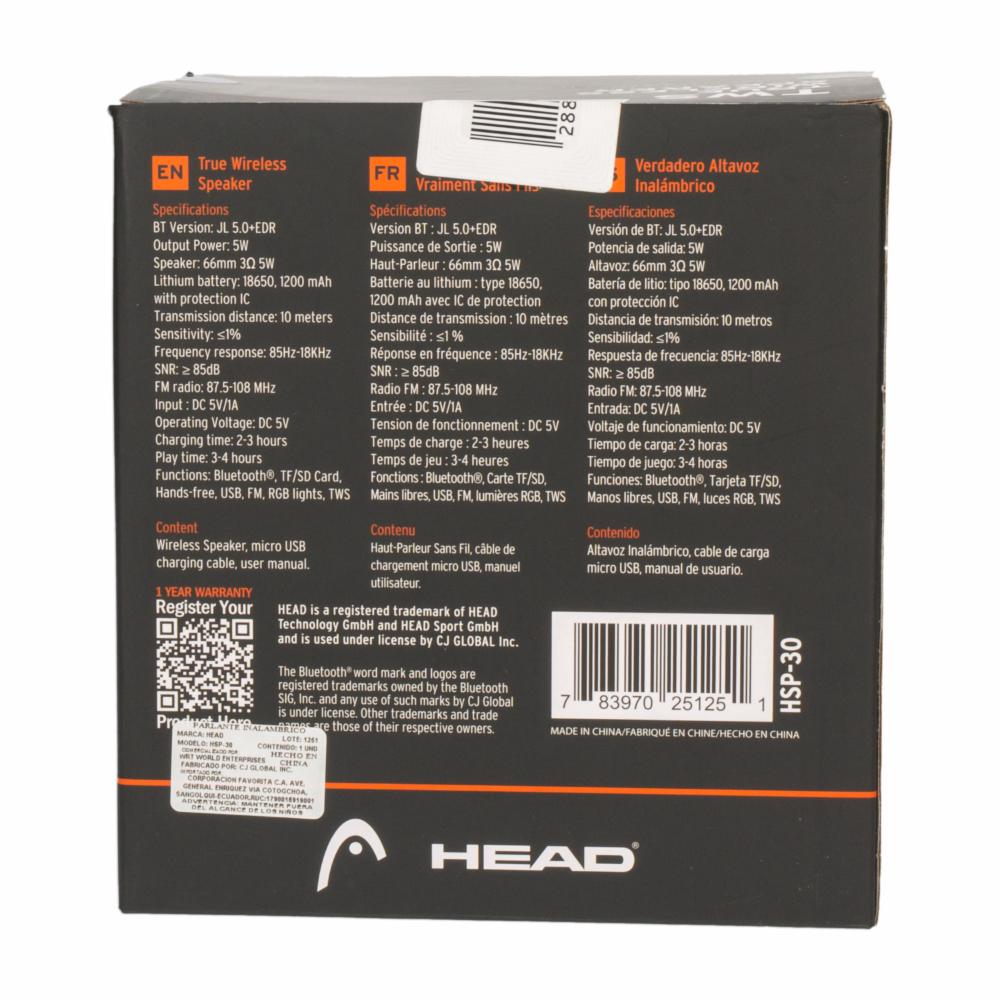 Características: - Modelo: HSP-30 - Potencia de salida: 5W - Batería de litio: tipo 18650, 1200 mah - Distancia de trasmisión: 10 Metros - Respuesta de frecuencia: 85hz - 18khz - Tiempo de carga: 2 a 3 horas - Tiempo de juego: 3 a 4 horas - Funciones: Bluetooth, tarjeta TF/SD, manos libres, USB, FM, luces RGB, TWS