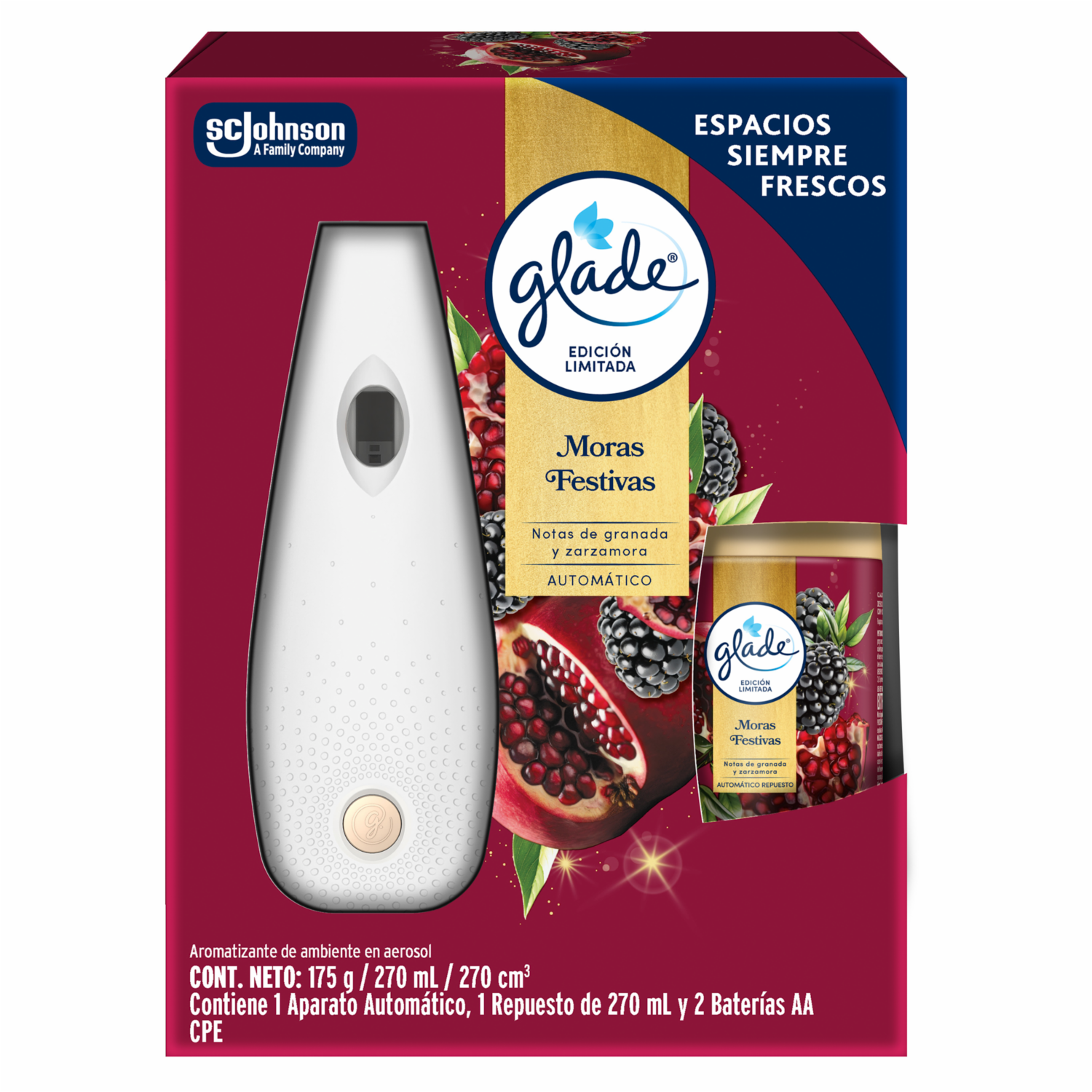 - Disfruta y siente el agradable aroma de esta deliciosa fragancia y vive momentos memorables con tus seres queridos. Podrás rociar en cualquier habitación de tu hogar y transformar el ambiente de manera instantánea. Puedes programar la frecuencia de emisión desde 9, 18 y hasta 36 minutos. Consiente a tu familia con un aroma acogedor y crea momentos que son un regalo con la nueva Edición Limitada de Navidad Glade® Moras Festivas