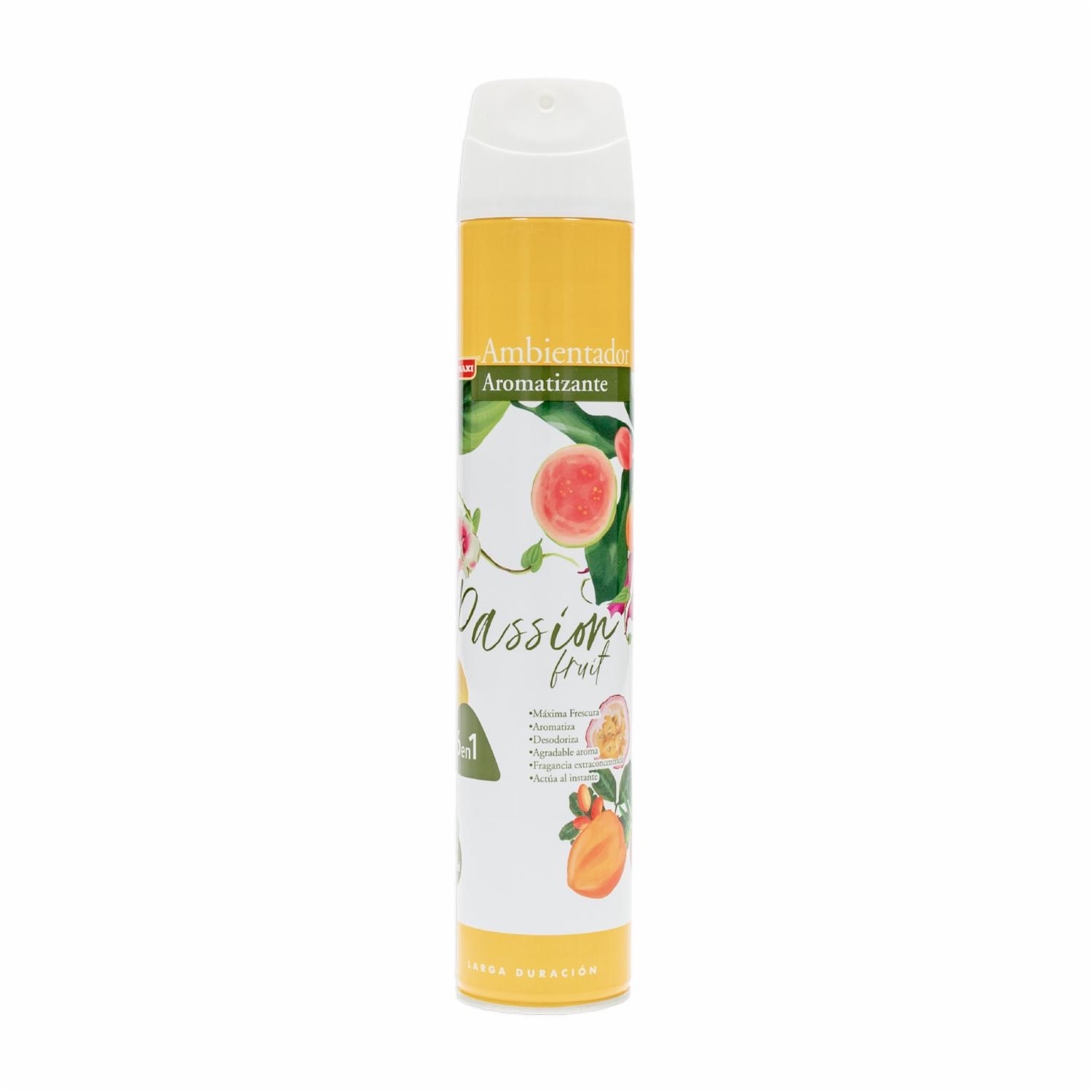 - Es un producto diseñado para perfumar y refrescar el ambiente de tu hogar u oficina con una fragancia agradable a fruta de la pasión, Este ambientador se presenta en forma de aerosol y es ideal para crear un ambiente fresco y acogedor en diferentes áreas de tu entorno
