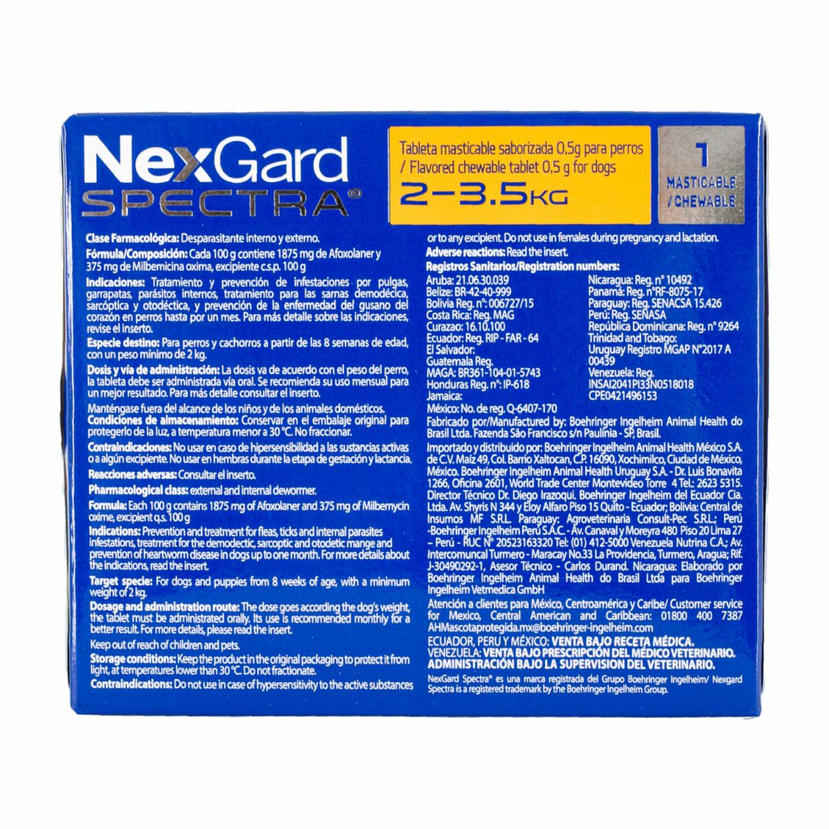 - El antiparasitario para perros en tableta masticable NexGard Spectra en la presentación "Extra Small" con 0,50 gramos es un producto diseñado para proteger a los perros muy pequeños de una amplia variedad de parásitos